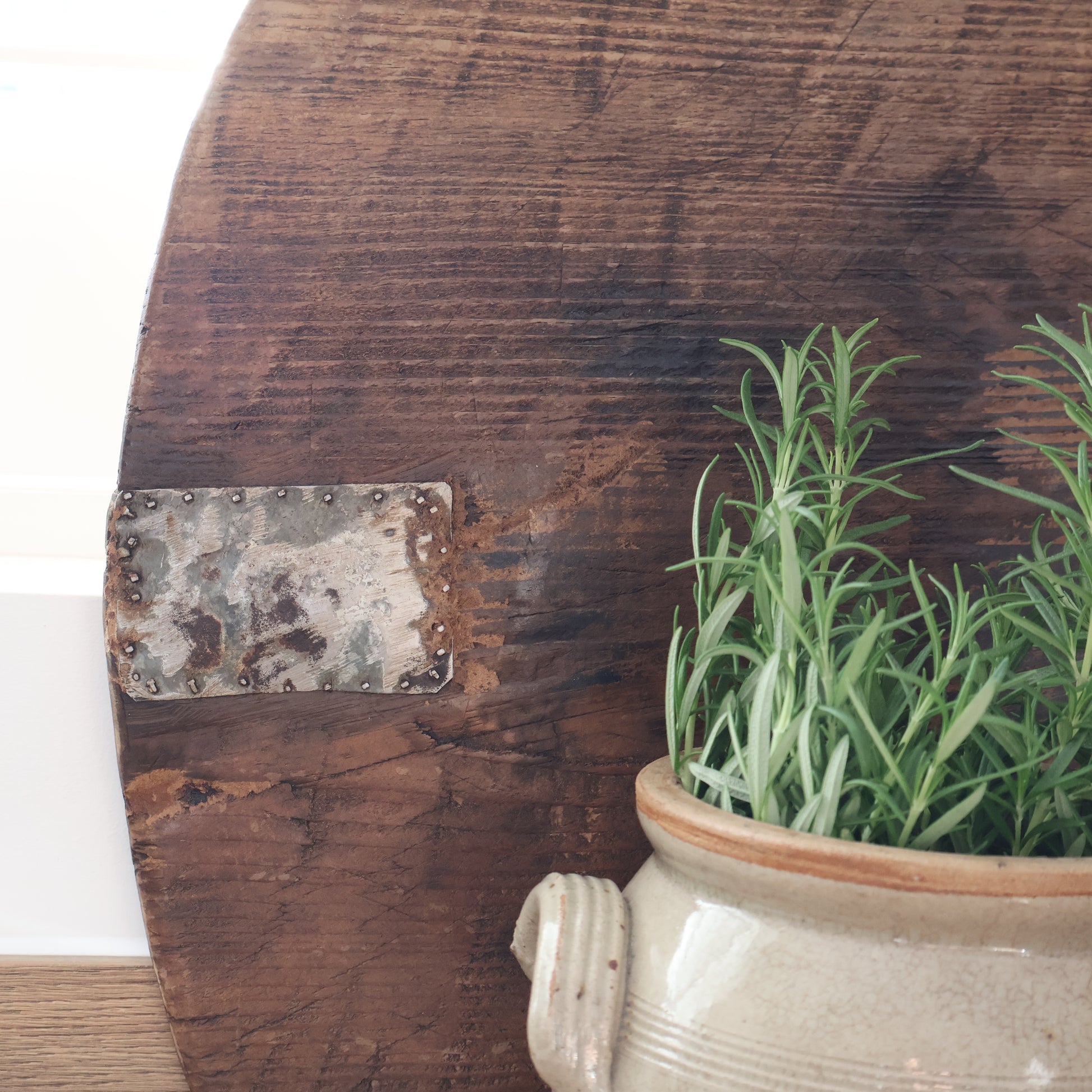 A large Turkish breadboard in dark wood featuring a metal repair patch that adds to it's beautiful timeworn character.