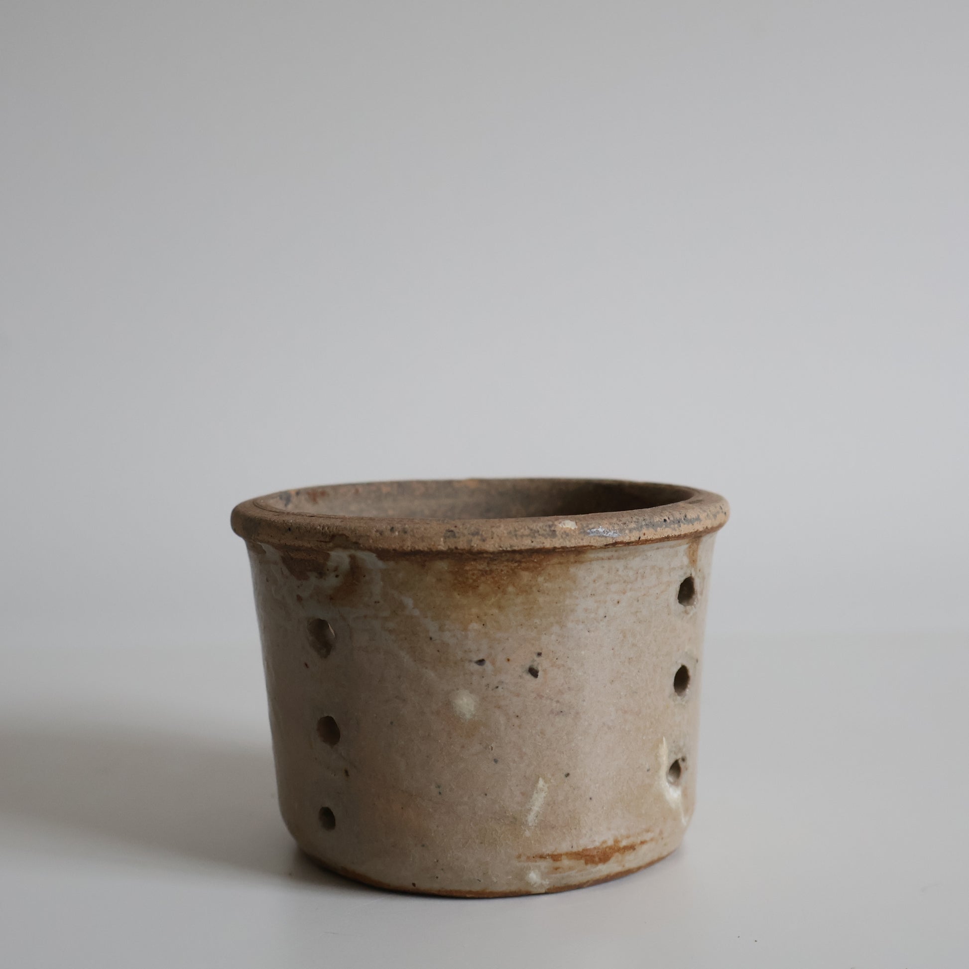 A small cheese strainer in taupe, with contrasting shades of tan and off white through out.