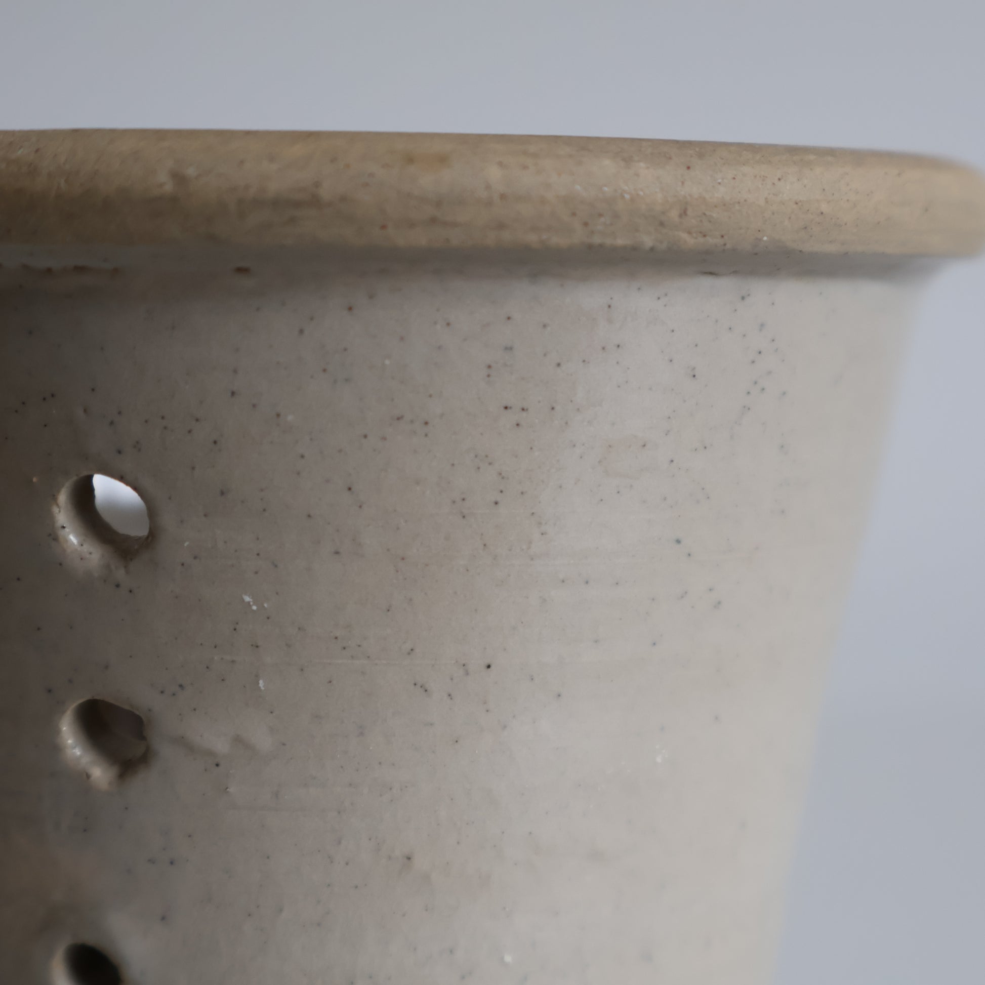 A sweet medium cheese strainer with three little feet, off-white in colour with subtle fleck detailing. Please note a fine hairline on one side, purely aesthetic with no movement.