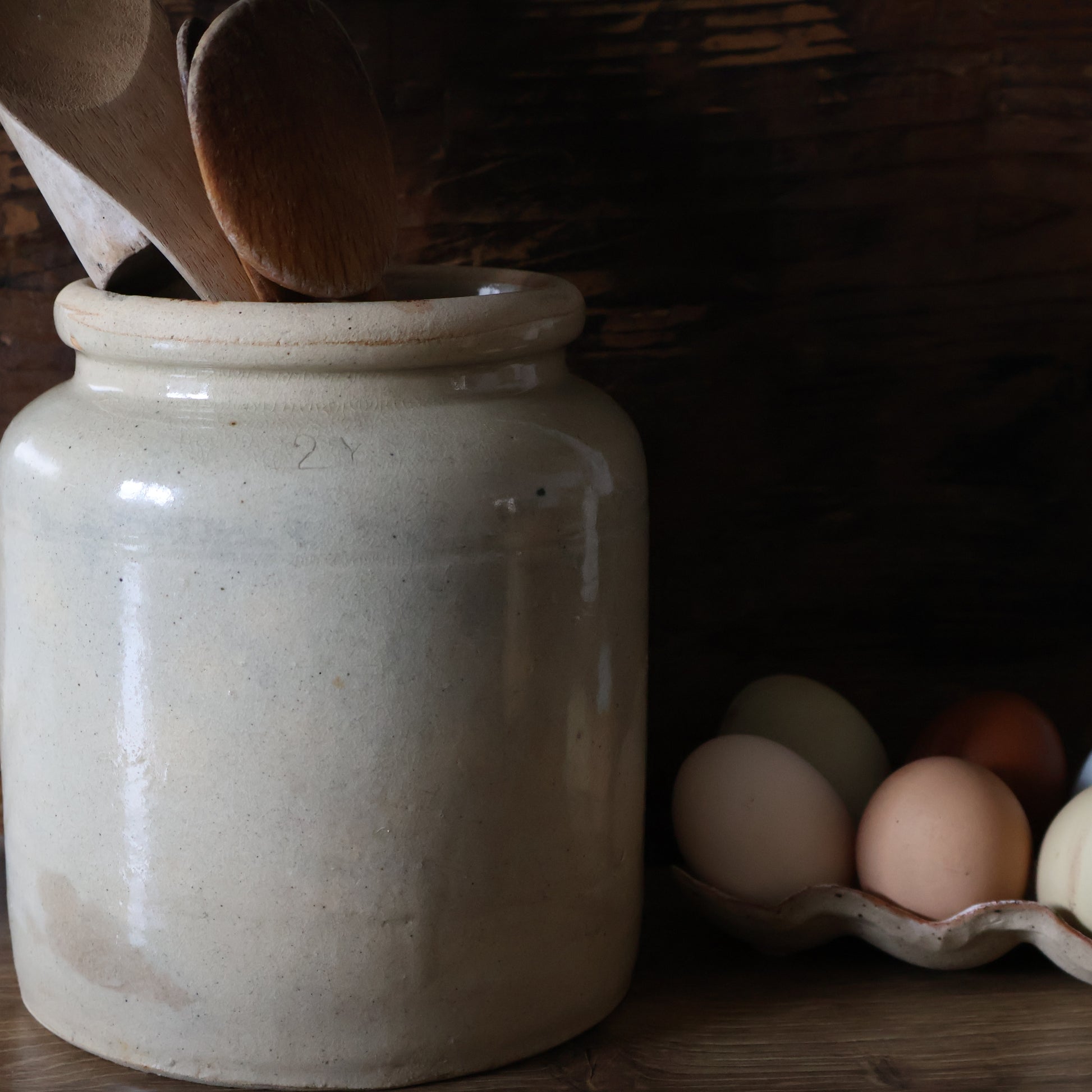A striking confit pot in delicate creamy tones, it has the most wonderful finely crazed glaze and subtle discolouration creating interest throughout.