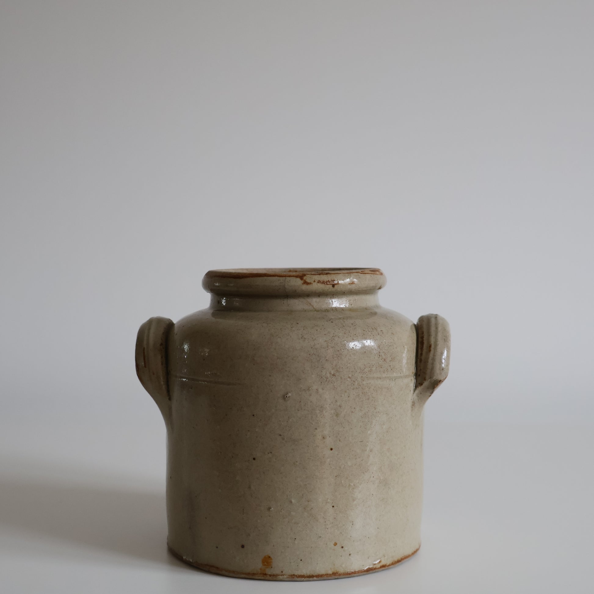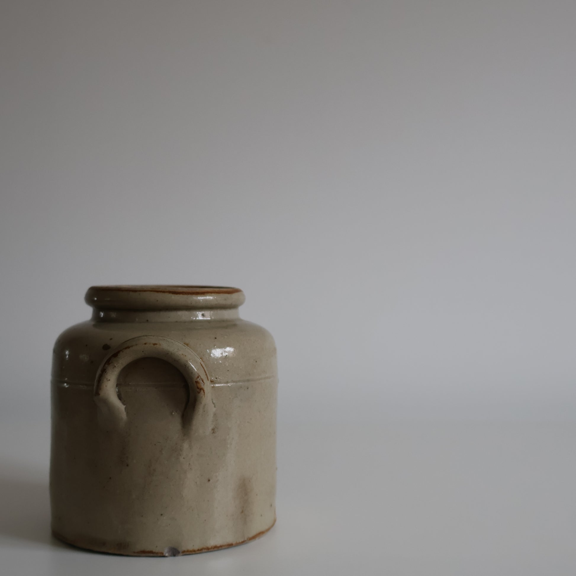 A mini beige toned confit pot featuring delicately curved rainbow handles.