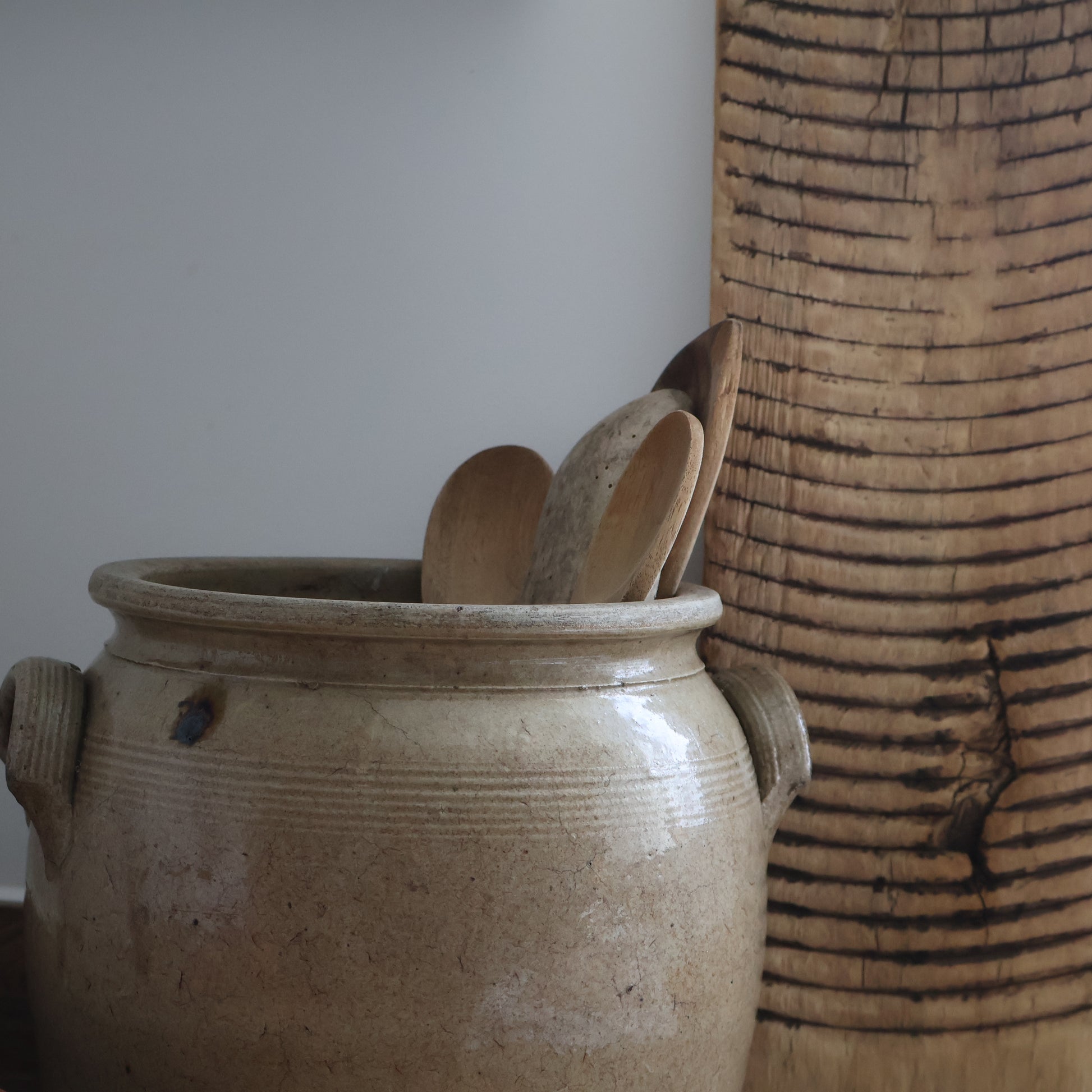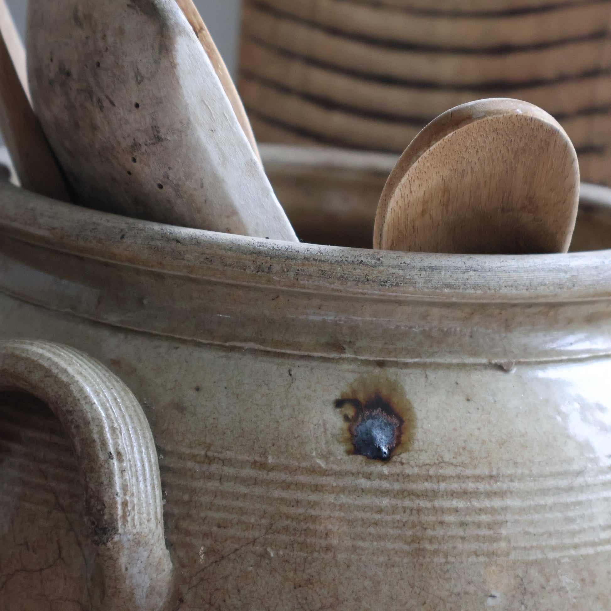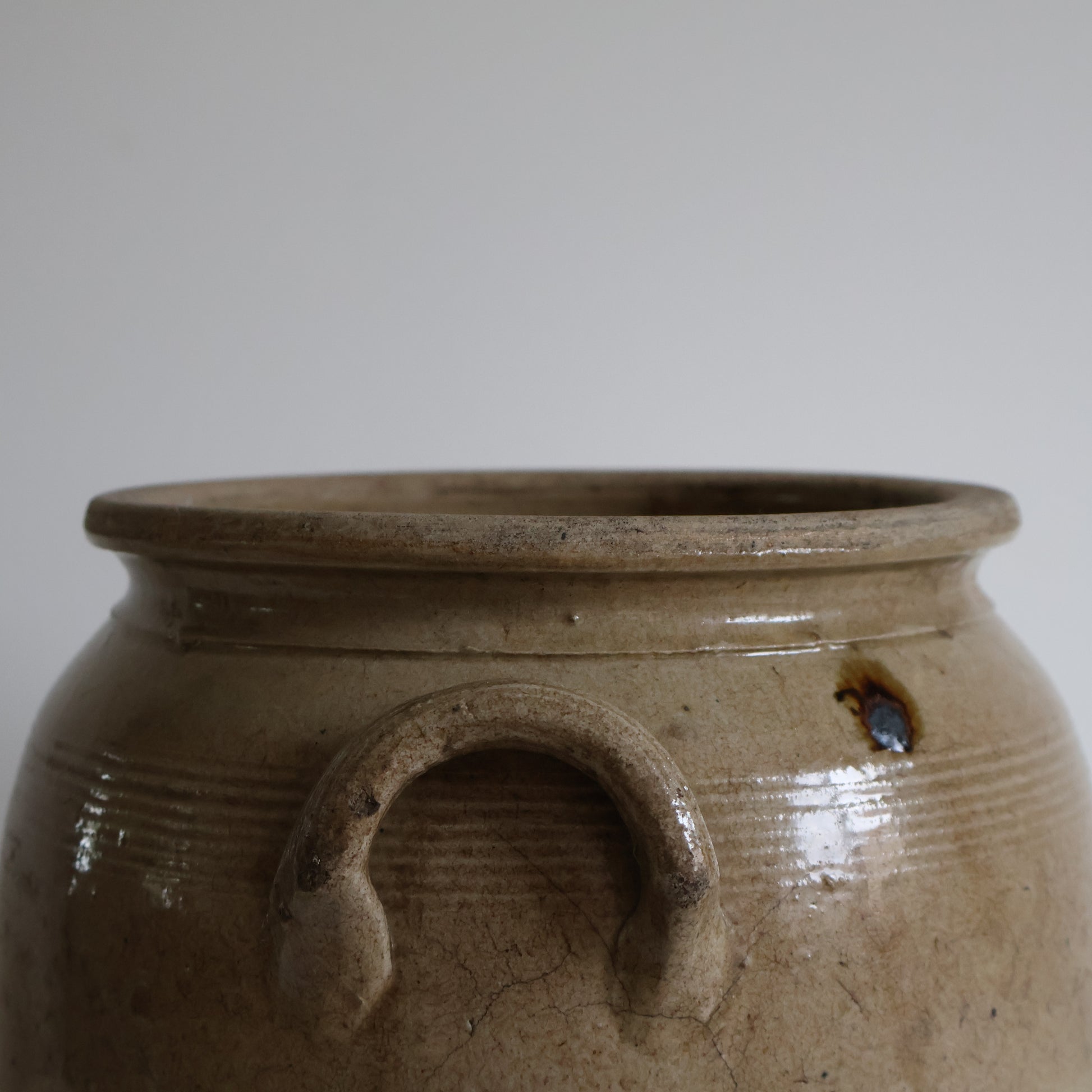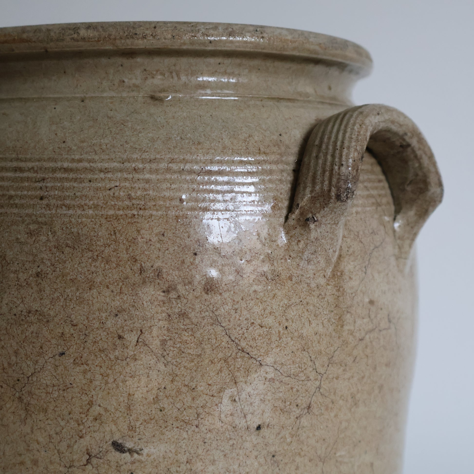 A large confit pot in warm taupe tones, featuring added character from subtle kiln drips.