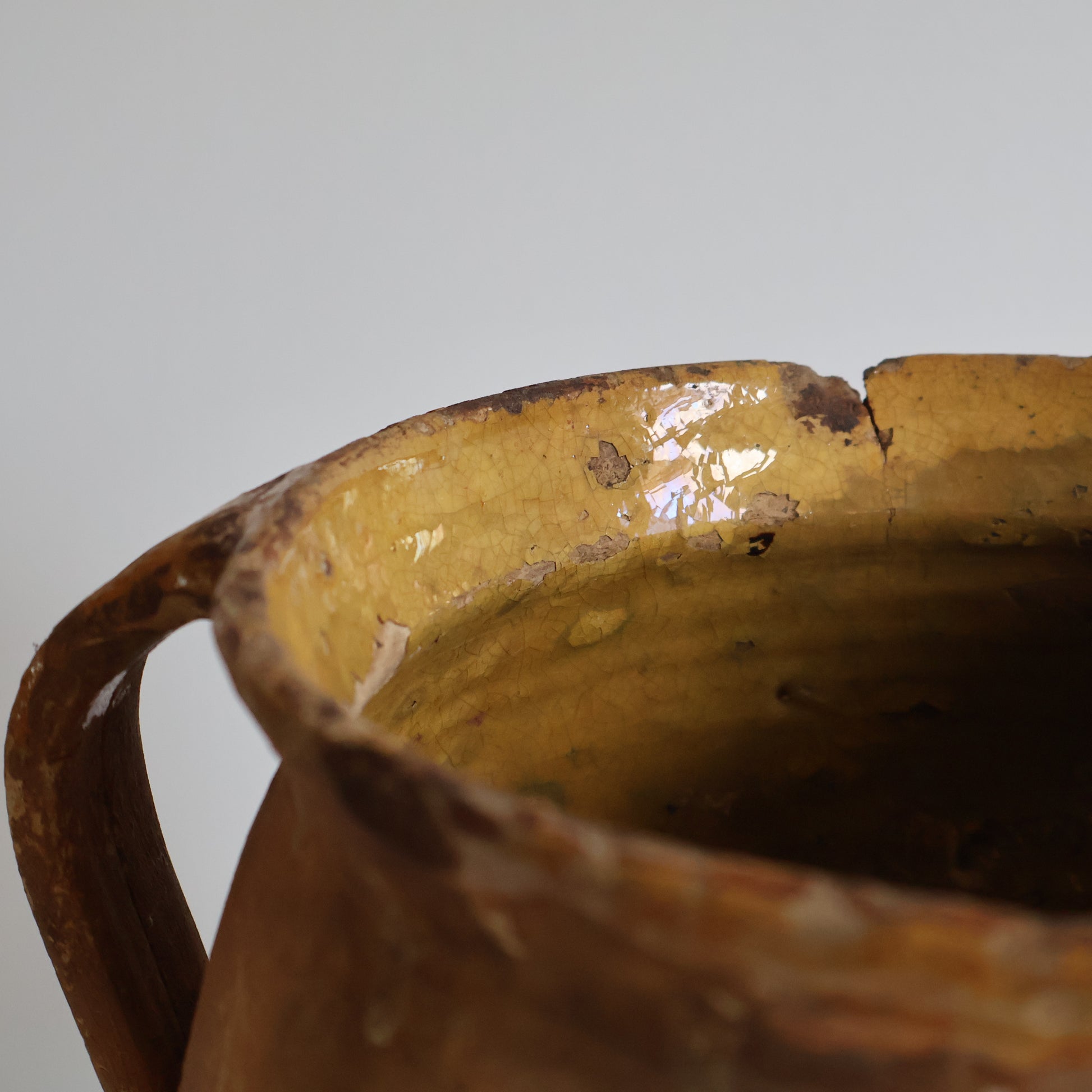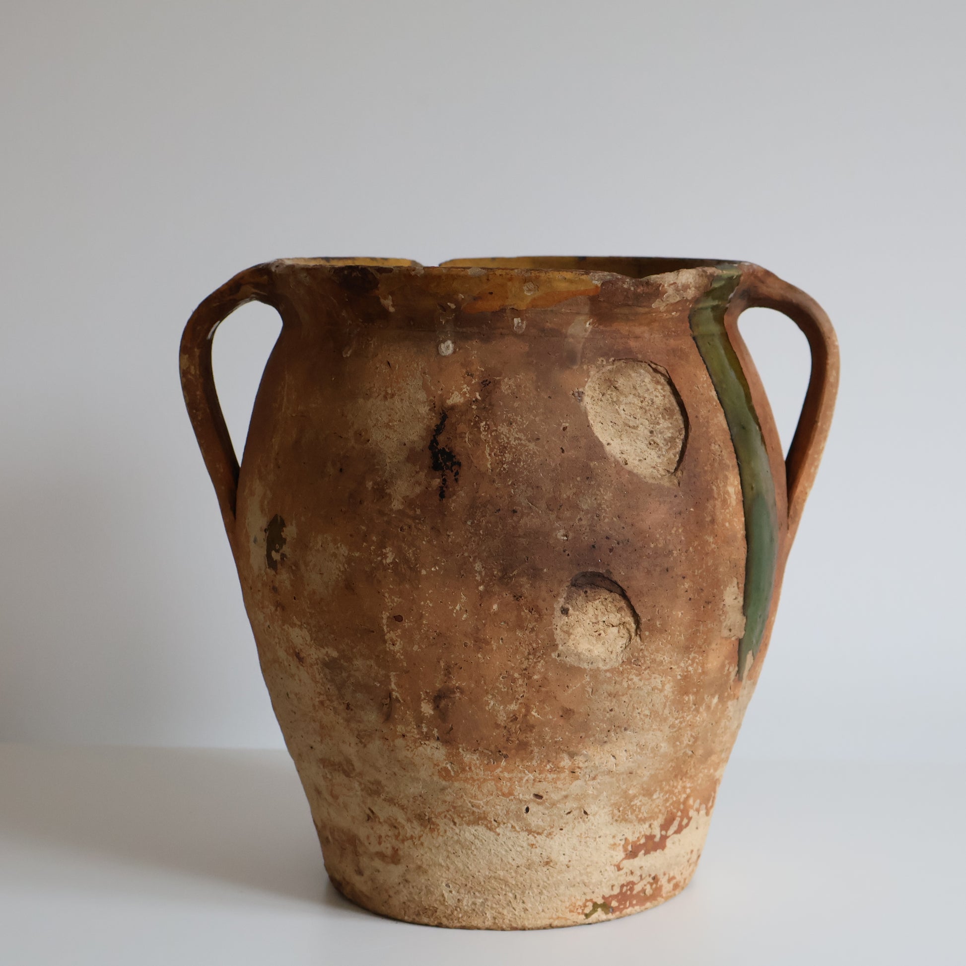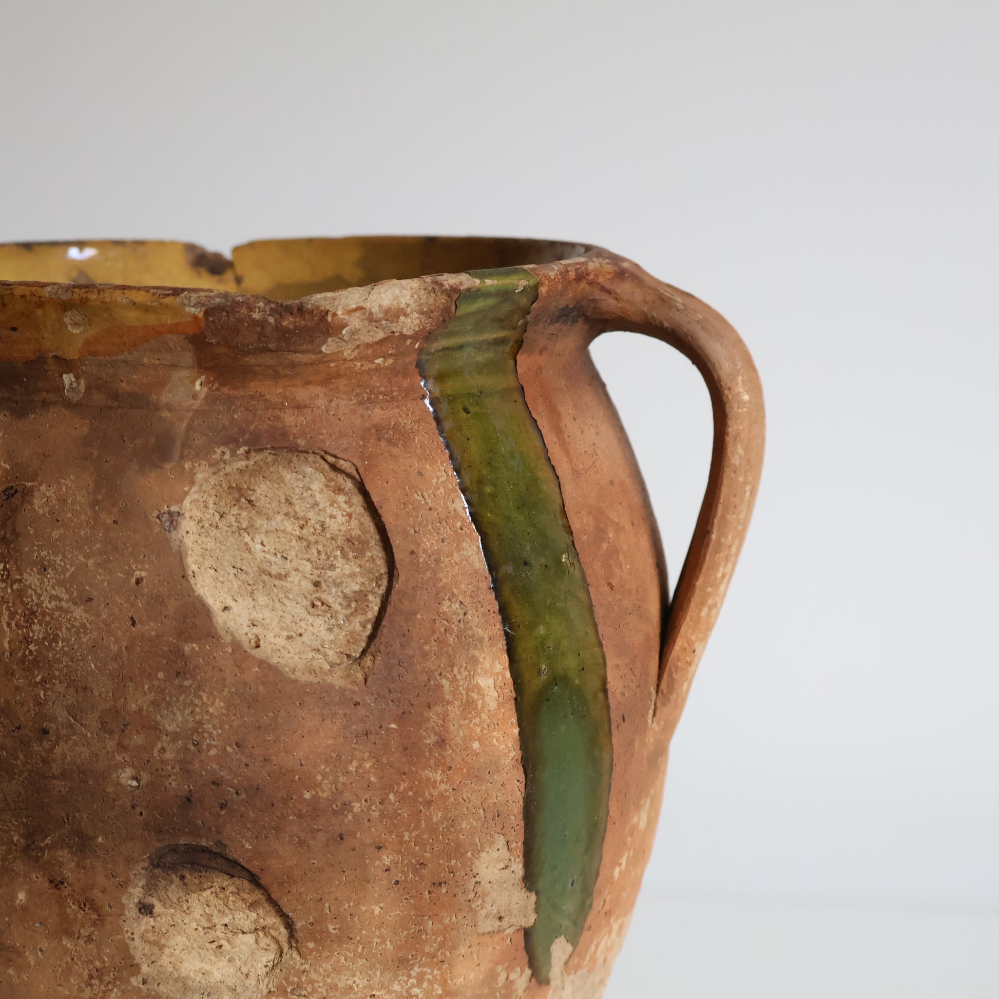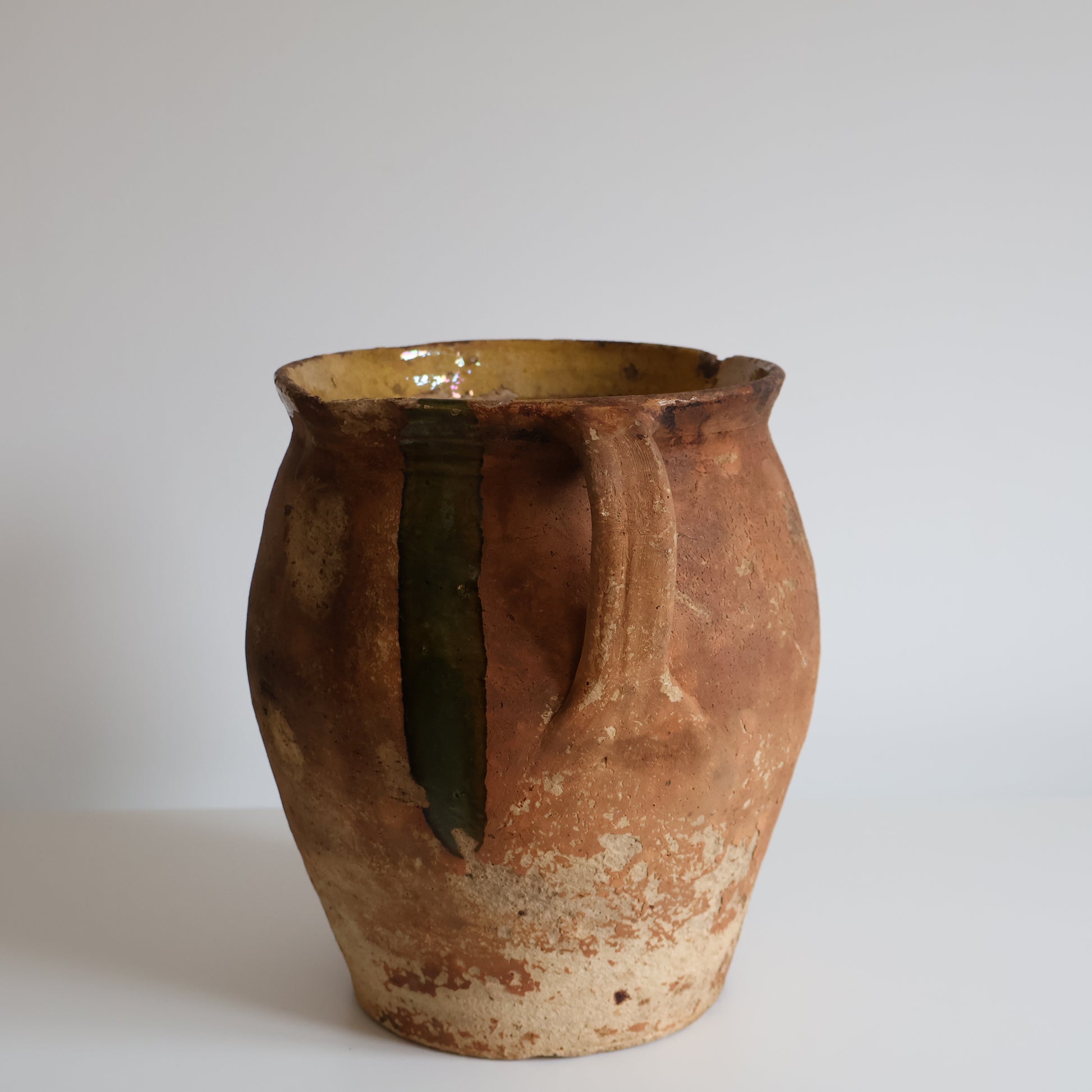 A beautifully aged terracotta confit pot with wonderful character, a deep yellow interior glaze, and green drip detailing on the outside. A rare piece that’s truly one of a kind.