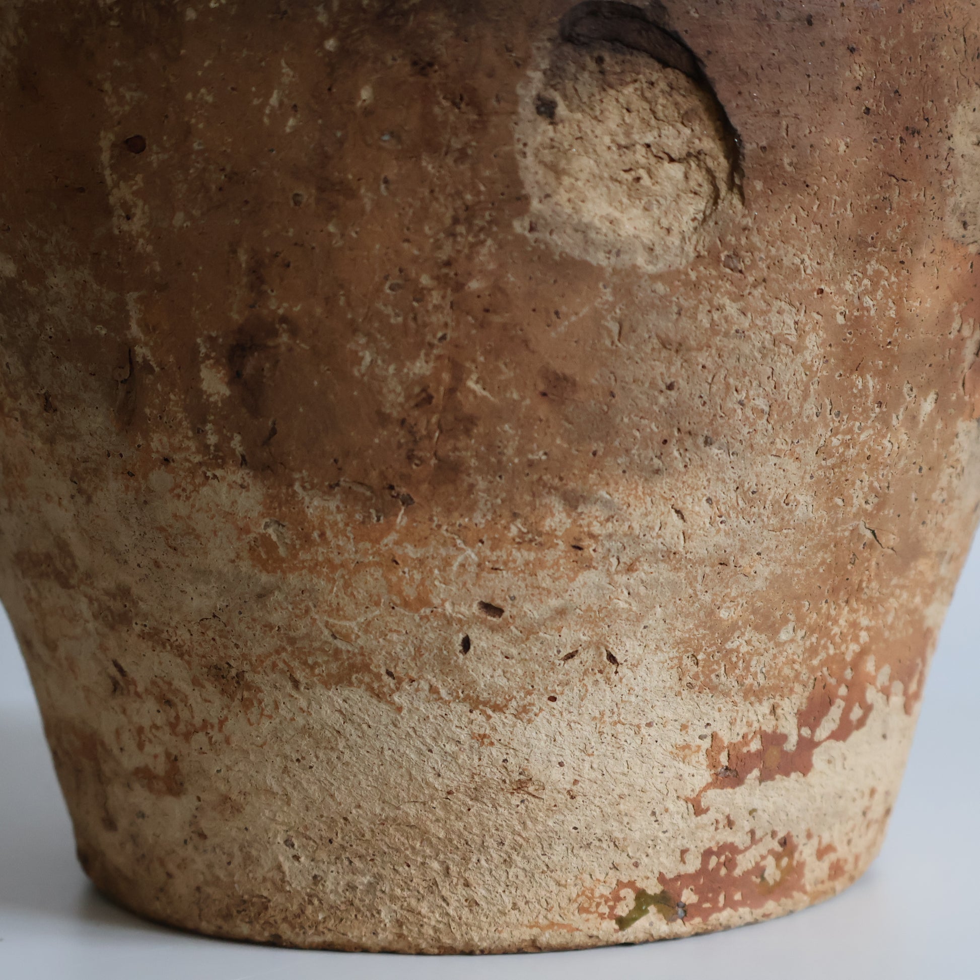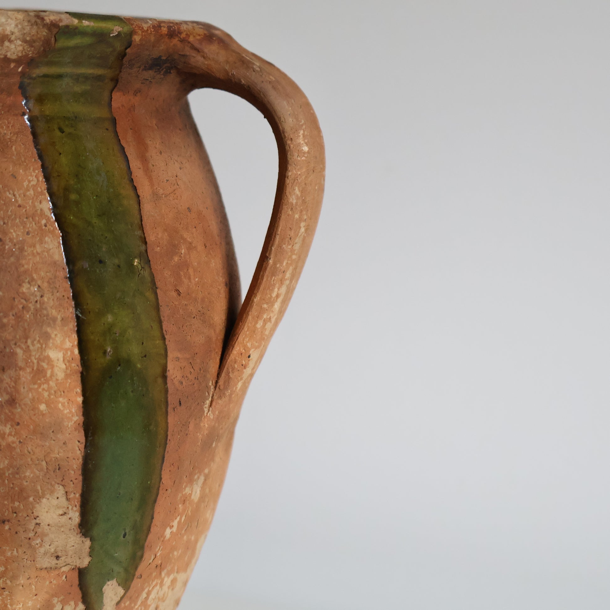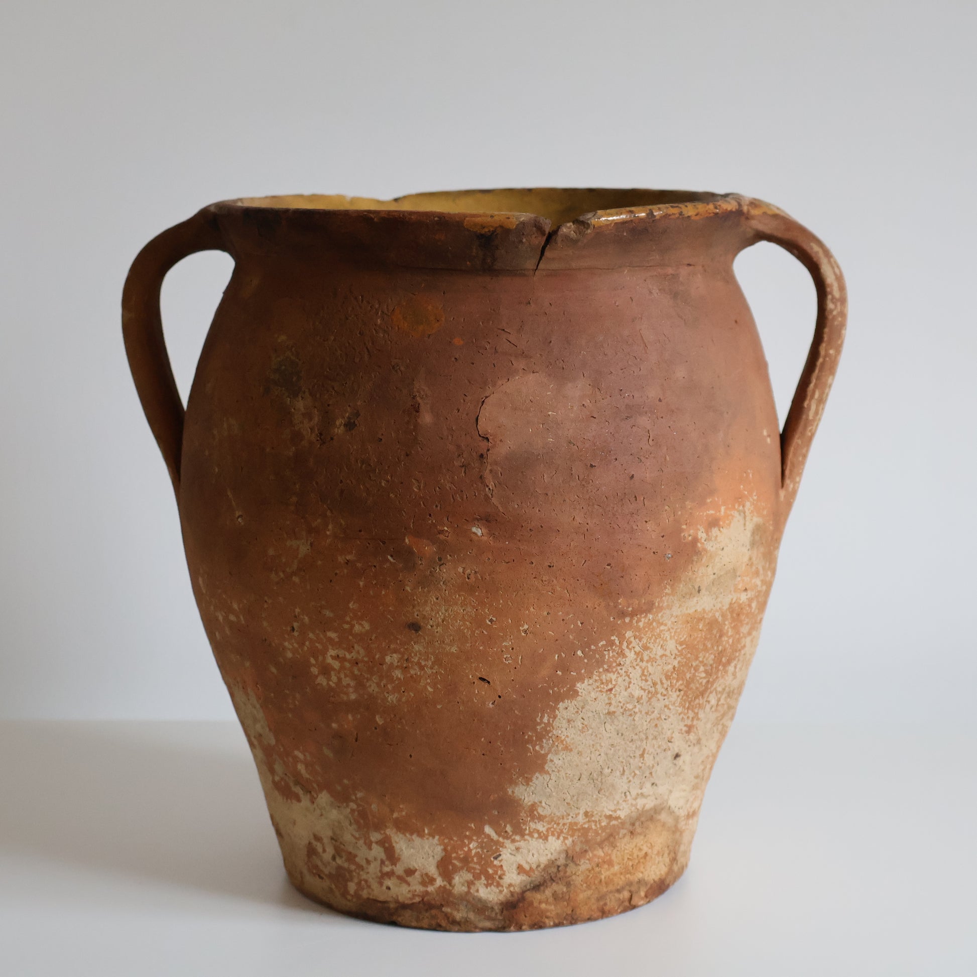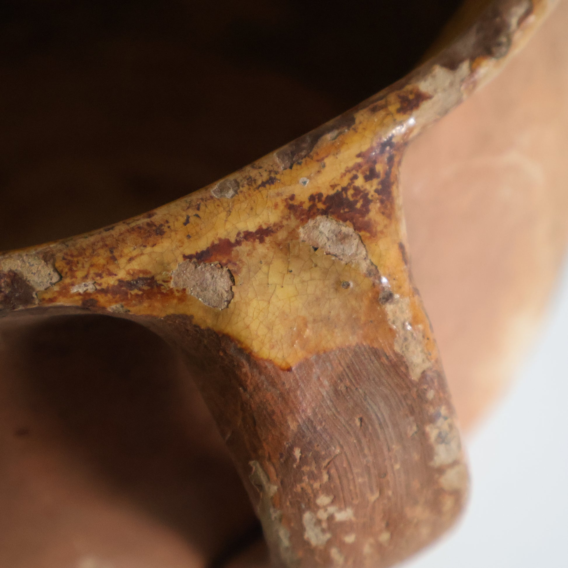 A beautifully aged terracotta confit pot with wonderful character, a deep yellow interior glaze, and green drip detailing on the outside. A rare piece that’s truly one of a kind.