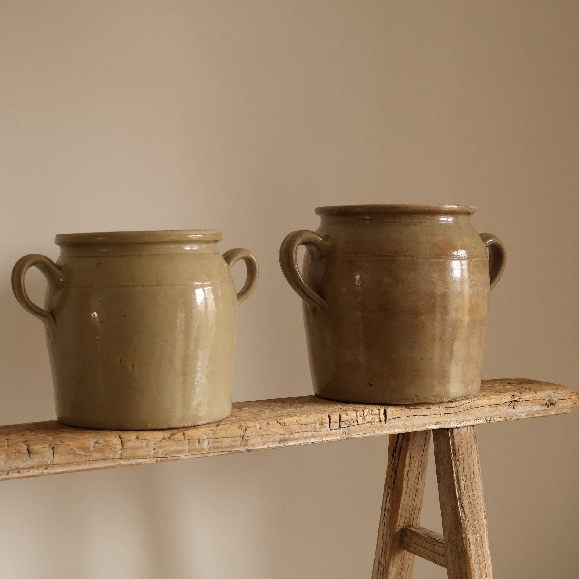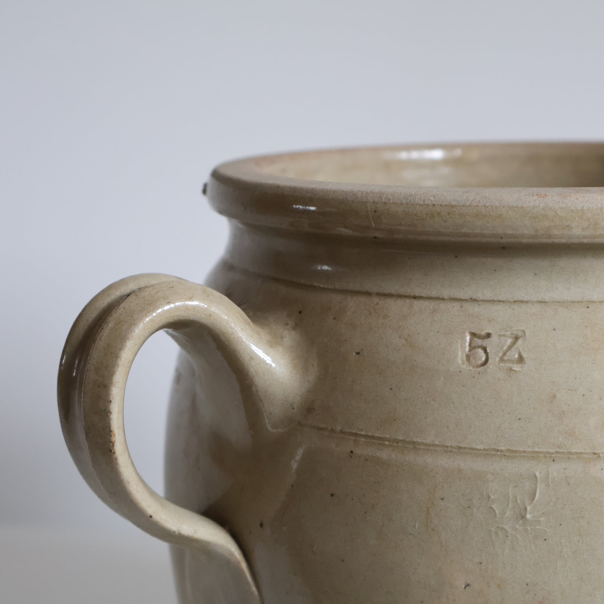 A beautiful medium sized loop handle confit pot in a soft cream glaze, full of charm and in wonderful condition for it's age.
