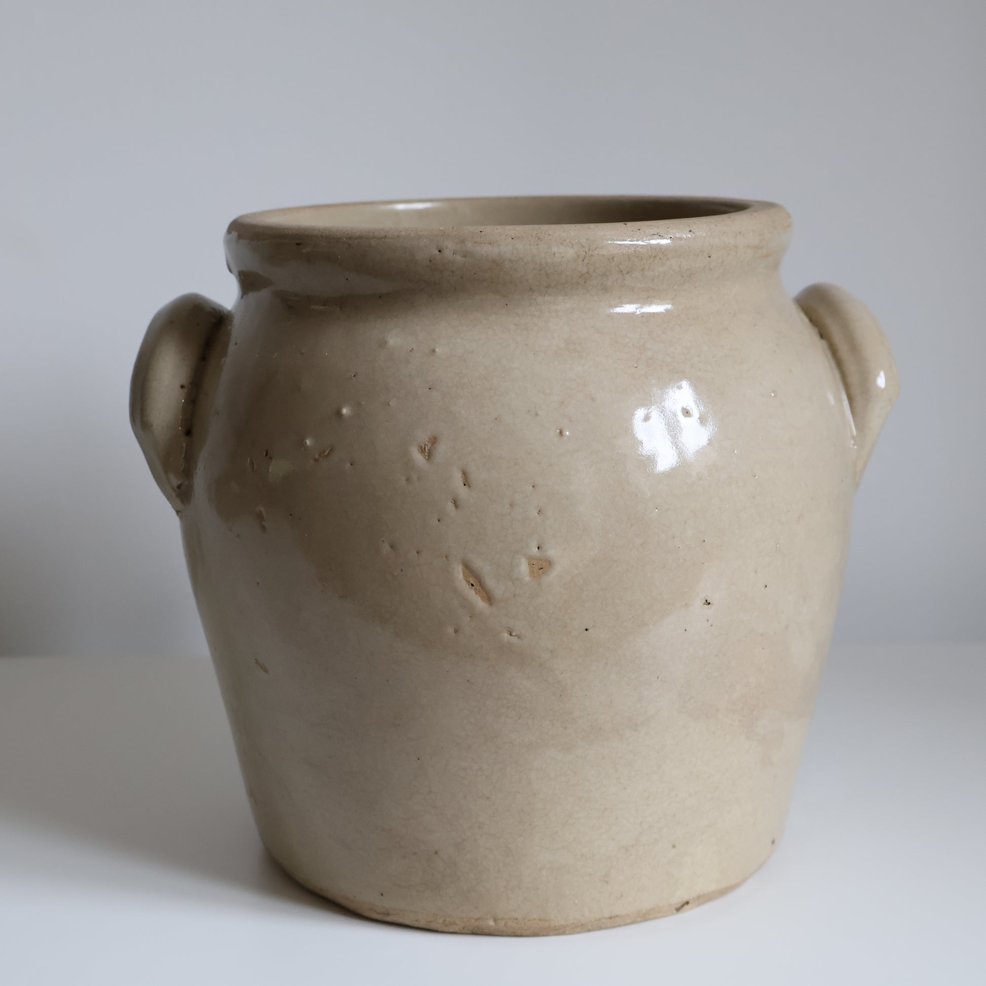 A medium off white confit pot with a lovely glossy glaze and elegant shape, finished with a subtle contrasting band at the base.