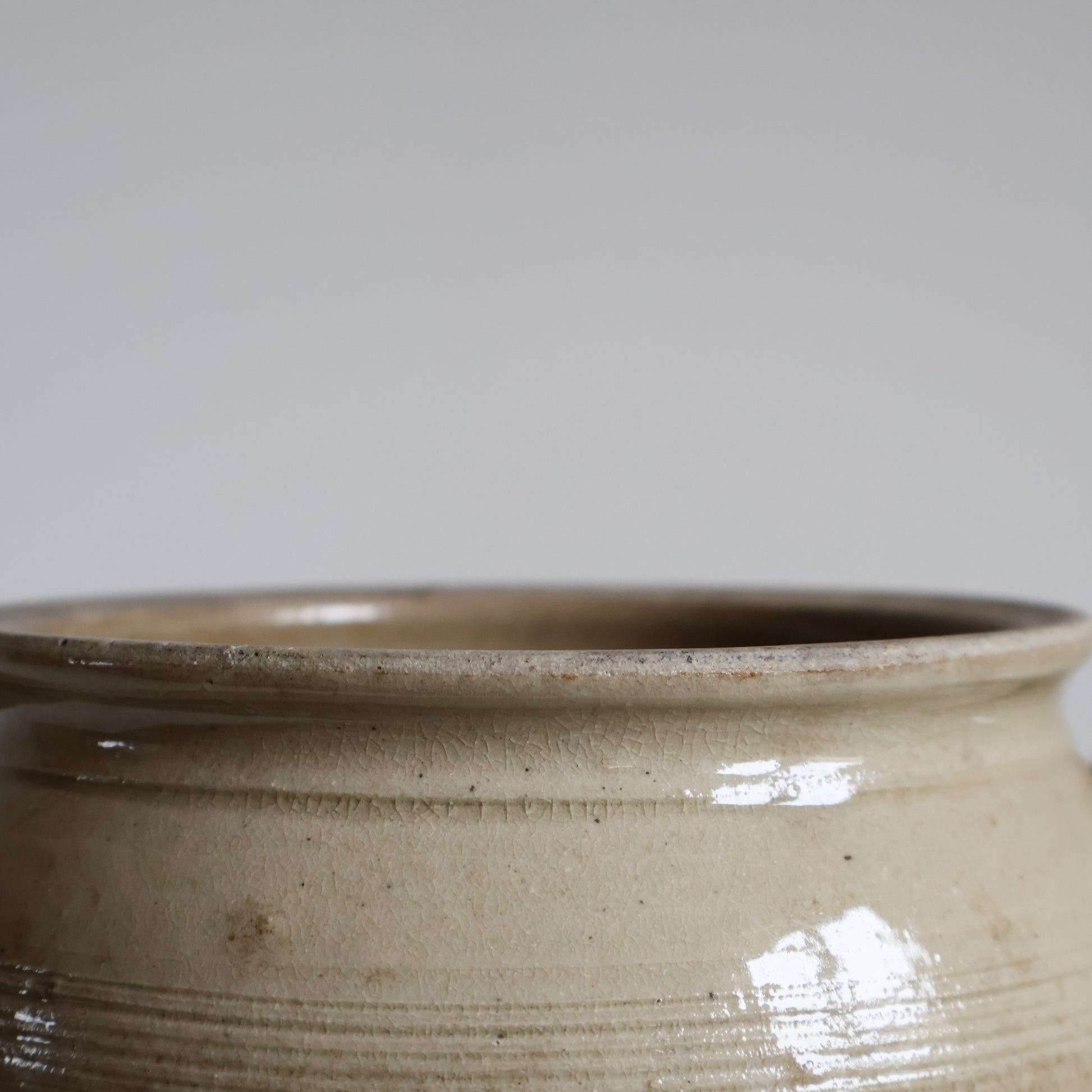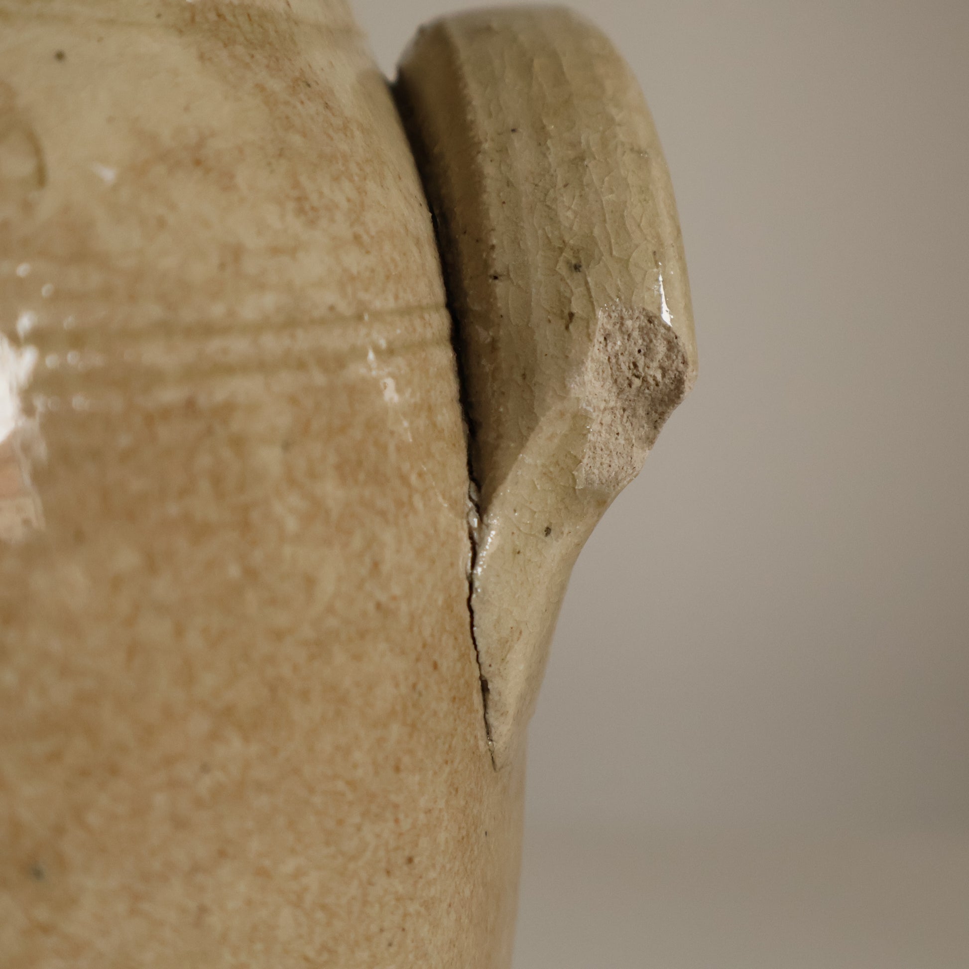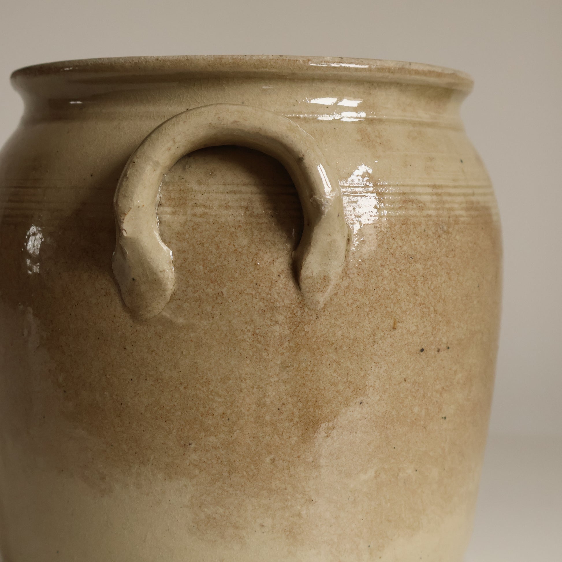 A small French confit pot with striking discolouration to the body, creating a two tone effect of warm and cool beige tones. It has very subtle crazing to the glaze. Please note a small chip to one handle, as photographed.