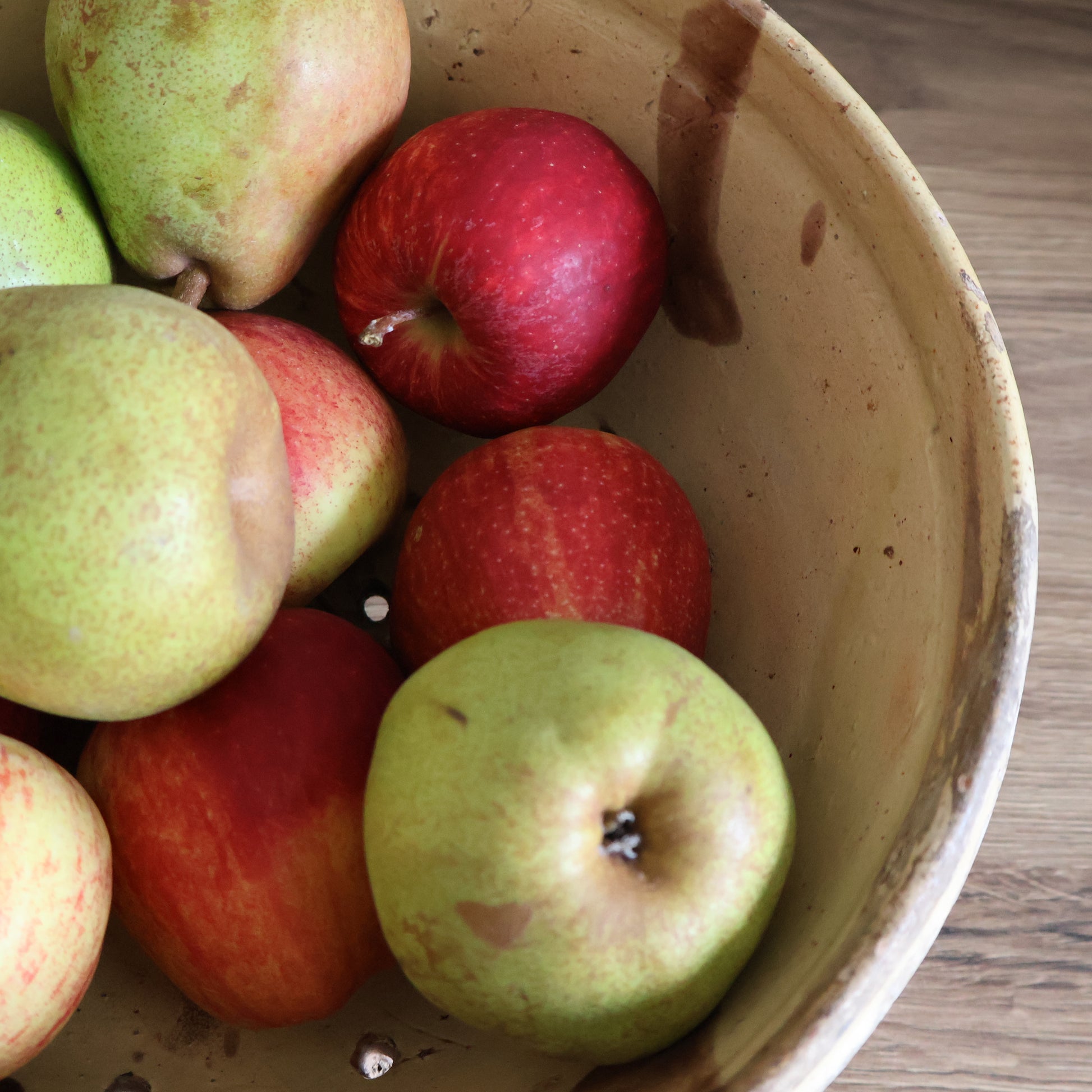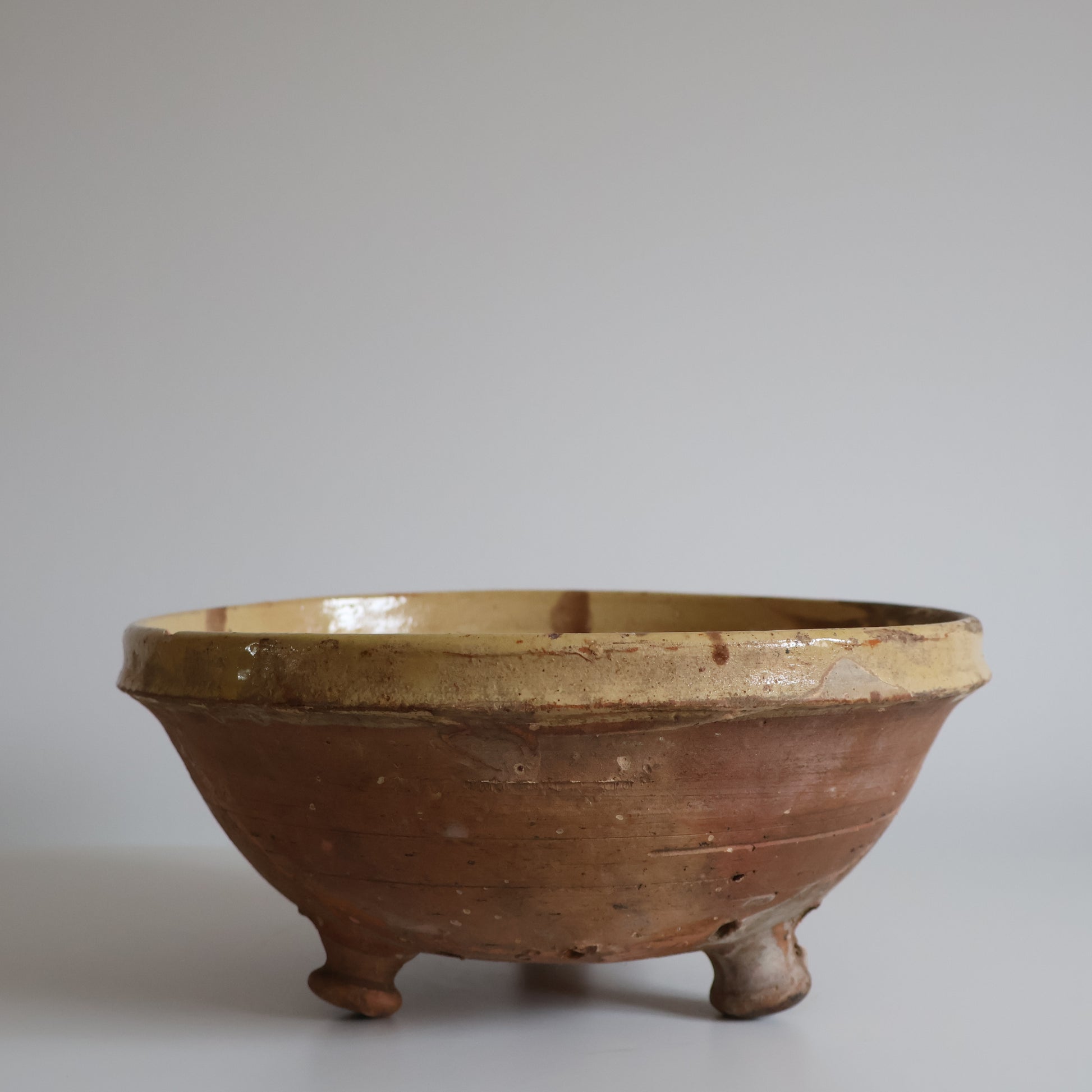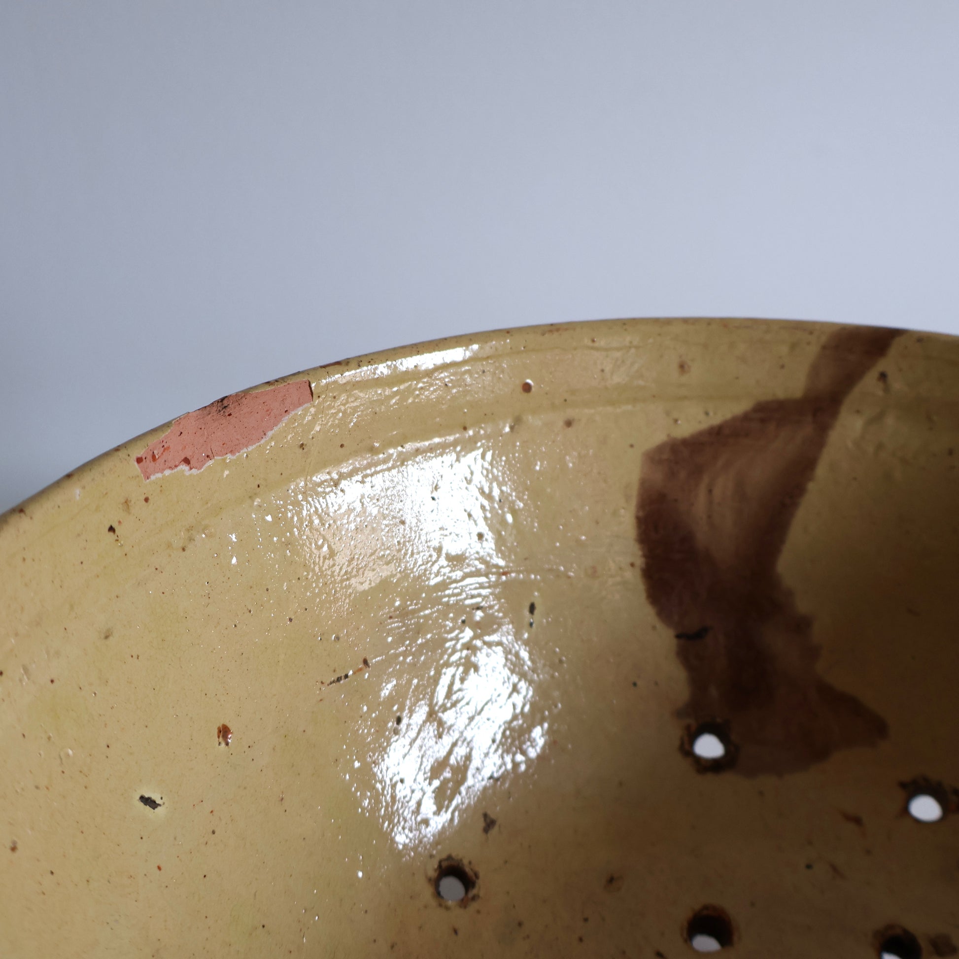 A unique French colander with warm yellow and brown glaze, terracotta exterior and beautifully aged patina, a rare find. Please note there are subtle age related marks.