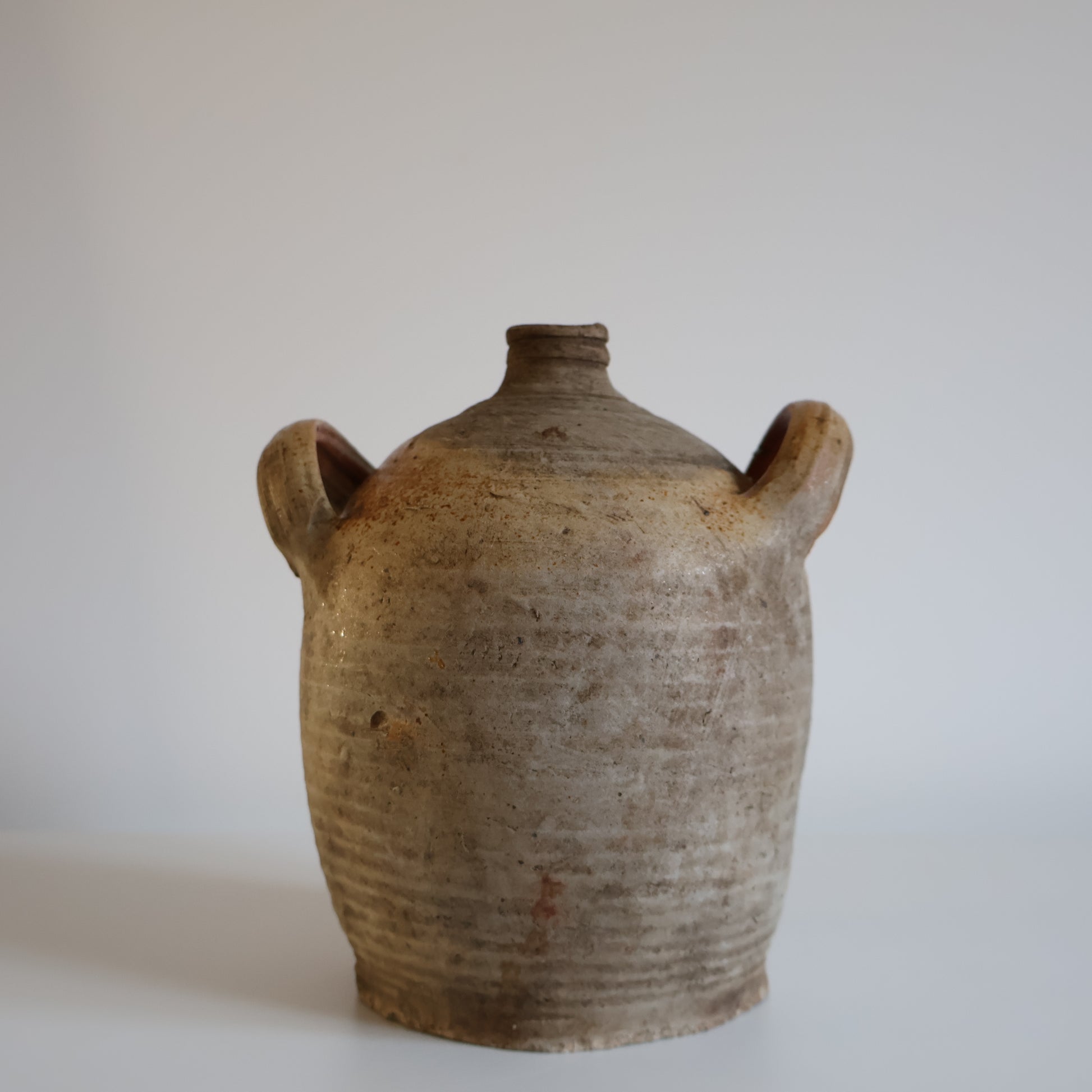 A small double handled French jug with the best of both worlds , a subtle drip glaze with brown blush and green tones, and an earthy, rustic patina.