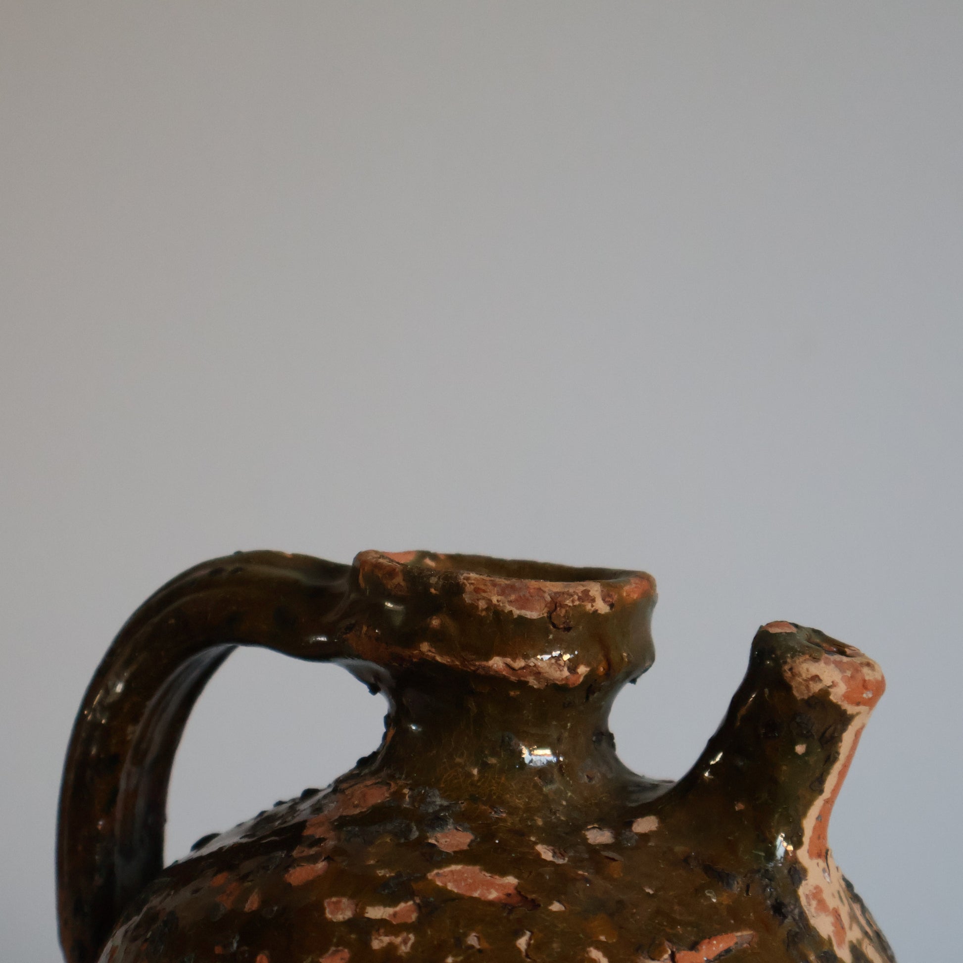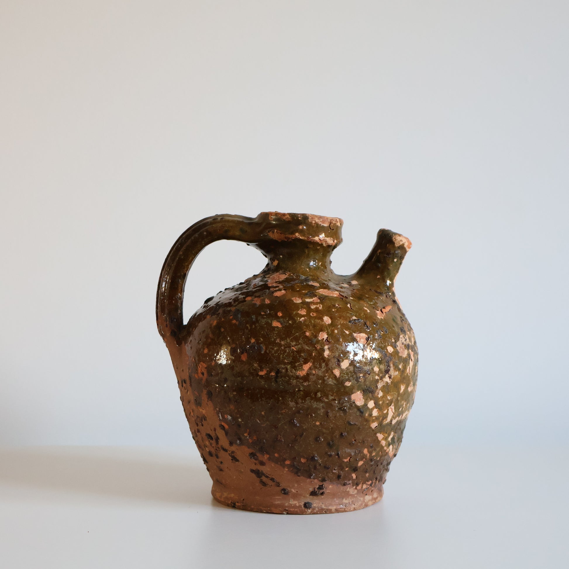 A small walnut oil jug, likely dating from the 18th century, beautifully aged with an olive green crackled glaze. A truly special character piece.