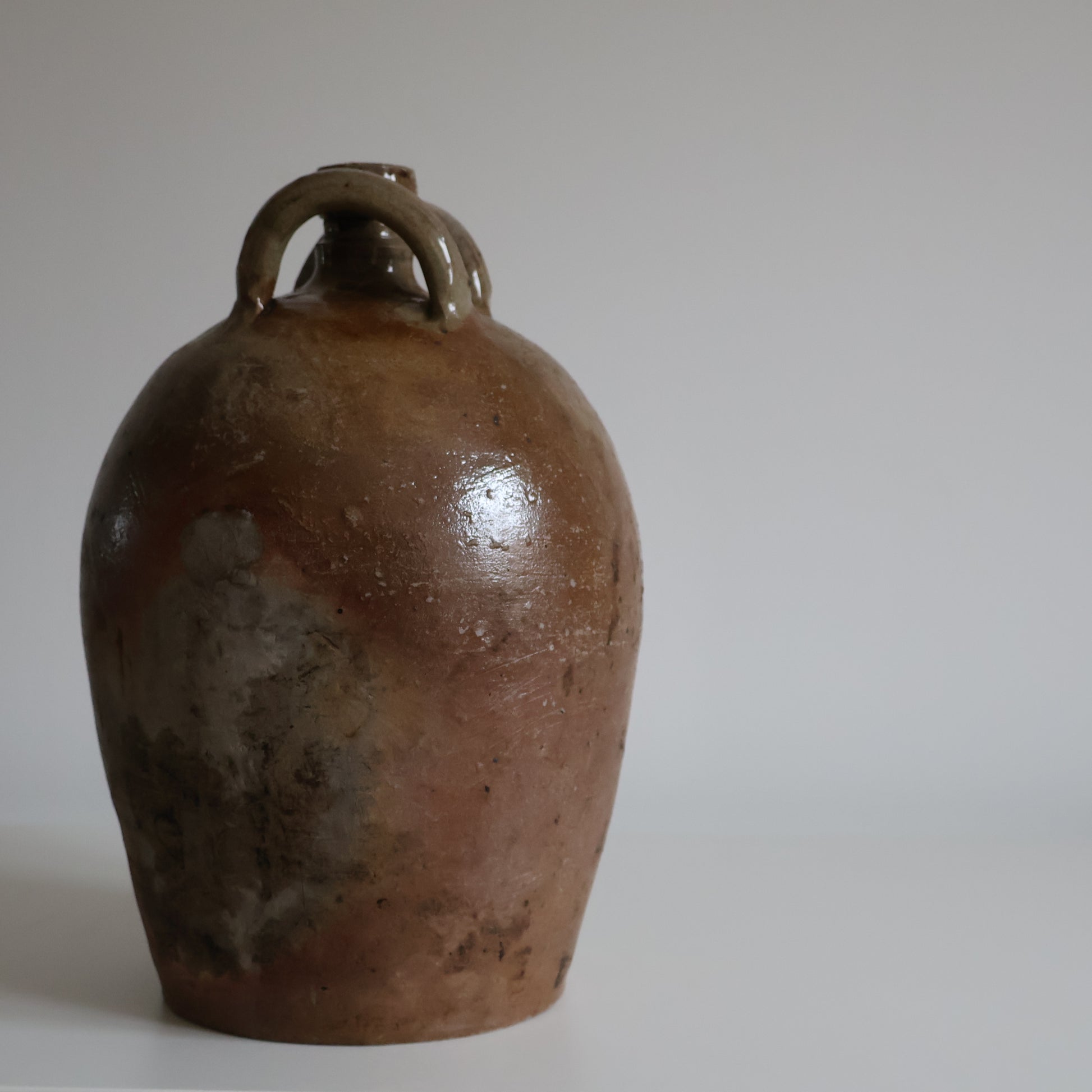 One of my favourite medium French jug finds. The glaze is full of autumnal warmth, with rich browns, deep blush tones, and soft earthy greys. The double handle shows a lovely mix of greens, beiges, and just a touch of pale lilac.