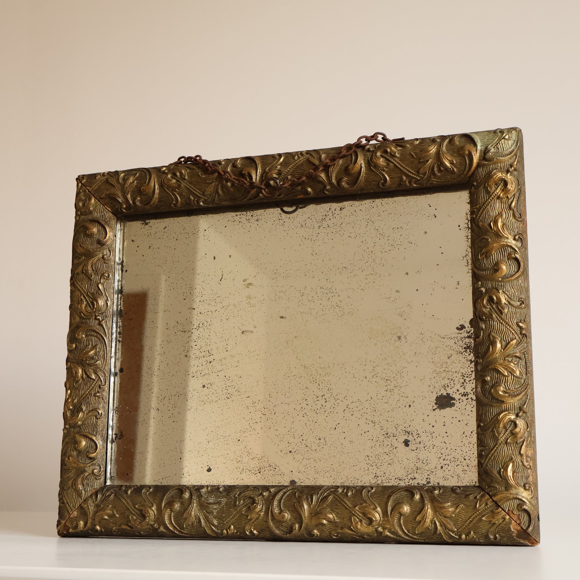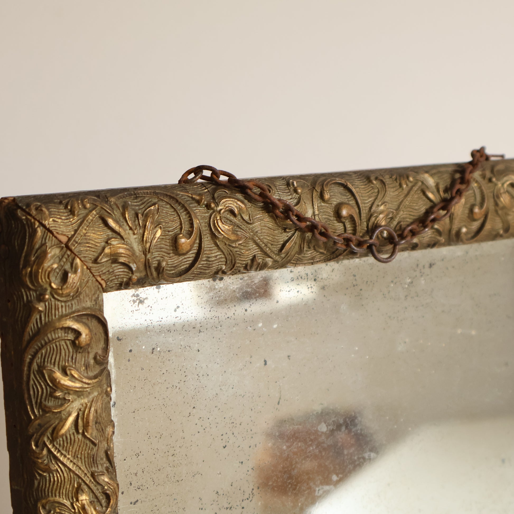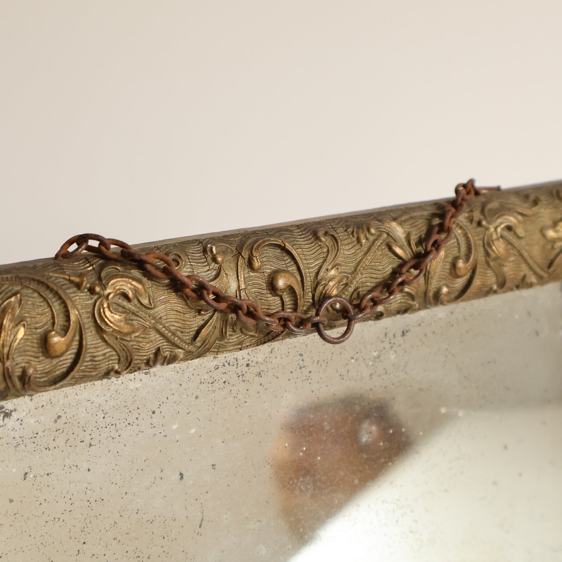 A delicate and charming antique French mirror in soft, muted gold, featuring an intricately detailed frame and classic mercury glass. Complete with a fine hanging chain, it is truly one of a kind. Please note this mirror is in antique condition: it shows evidence of woodworm, which has been treated, and the backing wood is very delicate and has been taped.