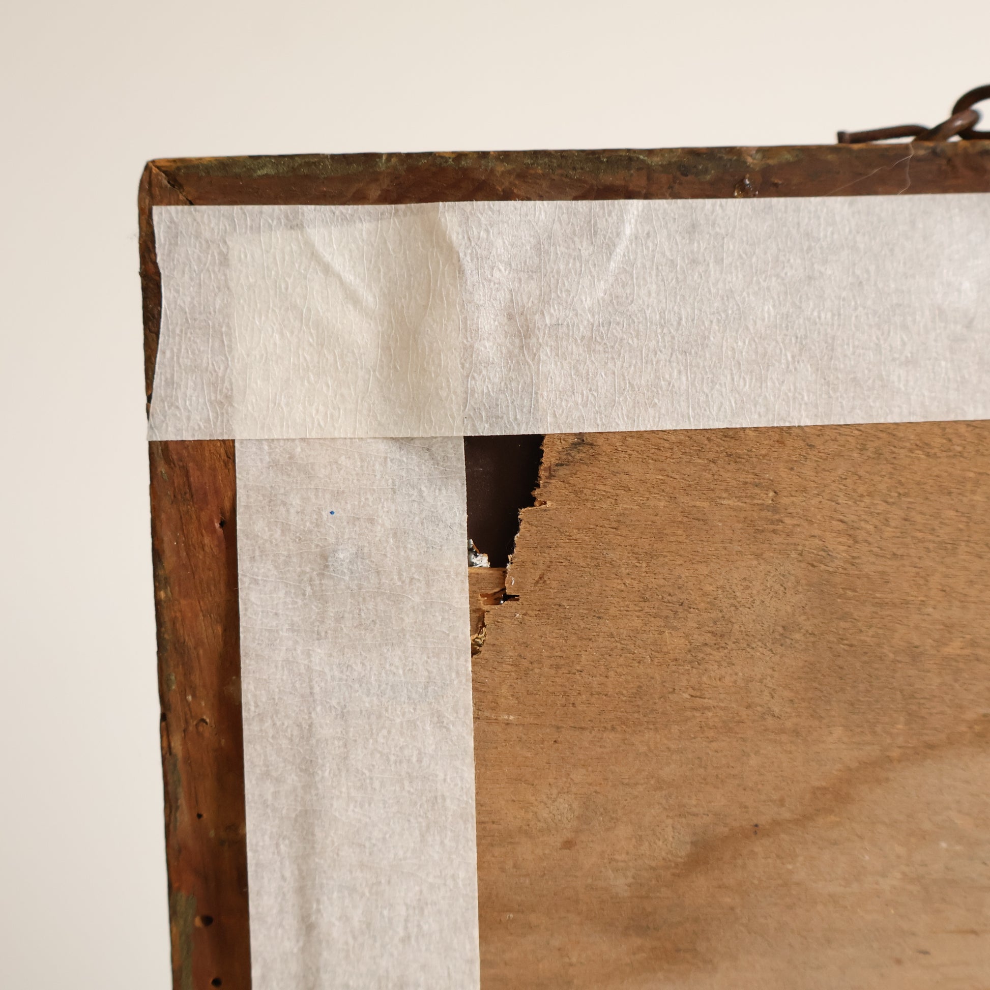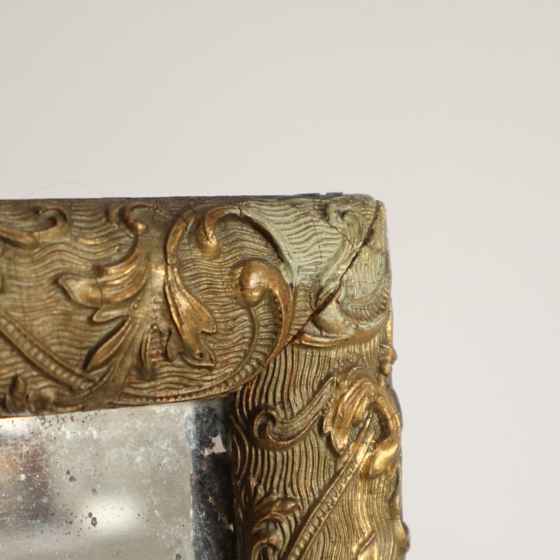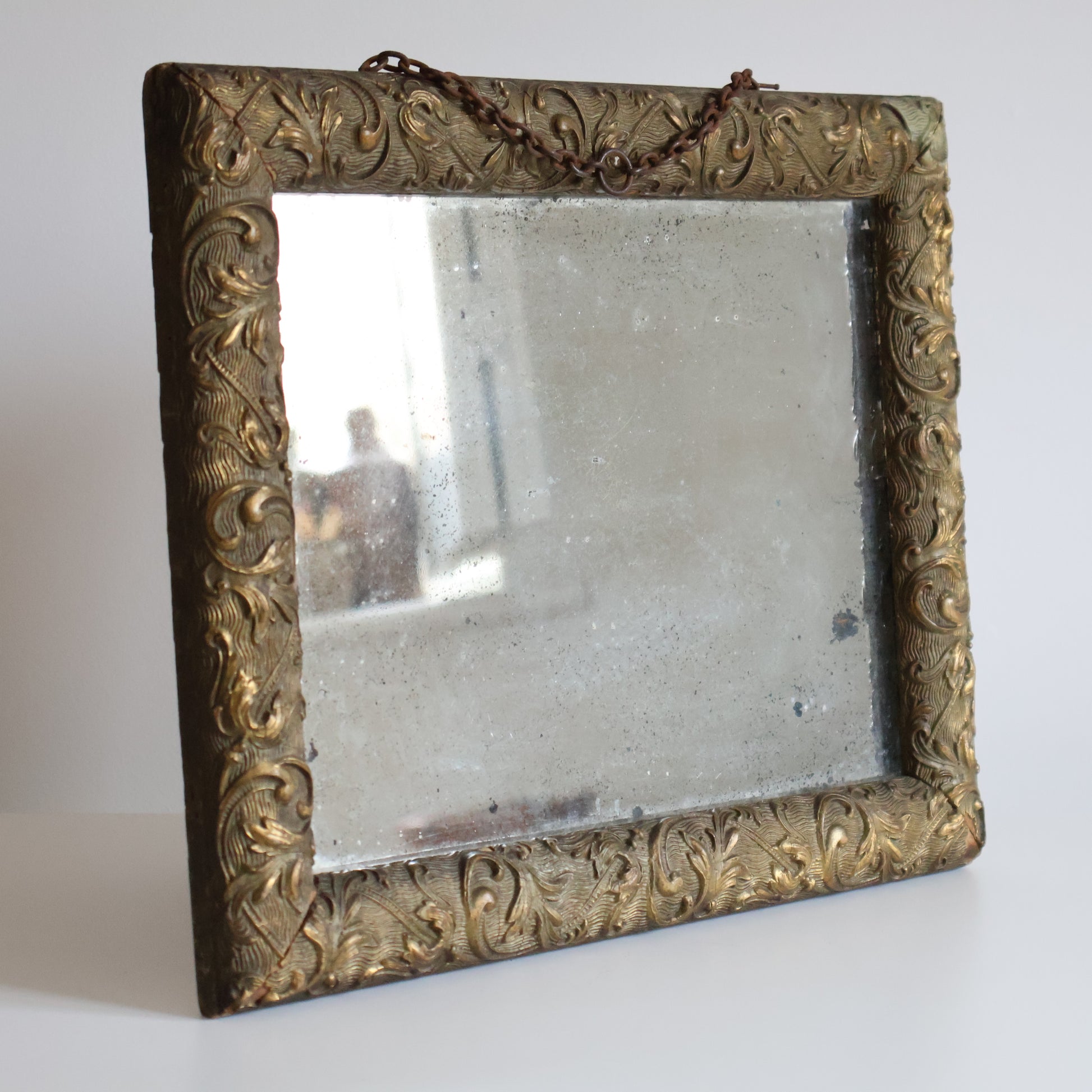 A delicate and charming antique French mirror in soft, muted gold, featuring an intricately detailed frame and classic mercury glass. Complete with a fine hanging chain, it is truly one of a kind. Please note this mirror is in antique condition: it shows evidence of woodworm, which has been treated, and the backing wood is very delicate and has been taped.