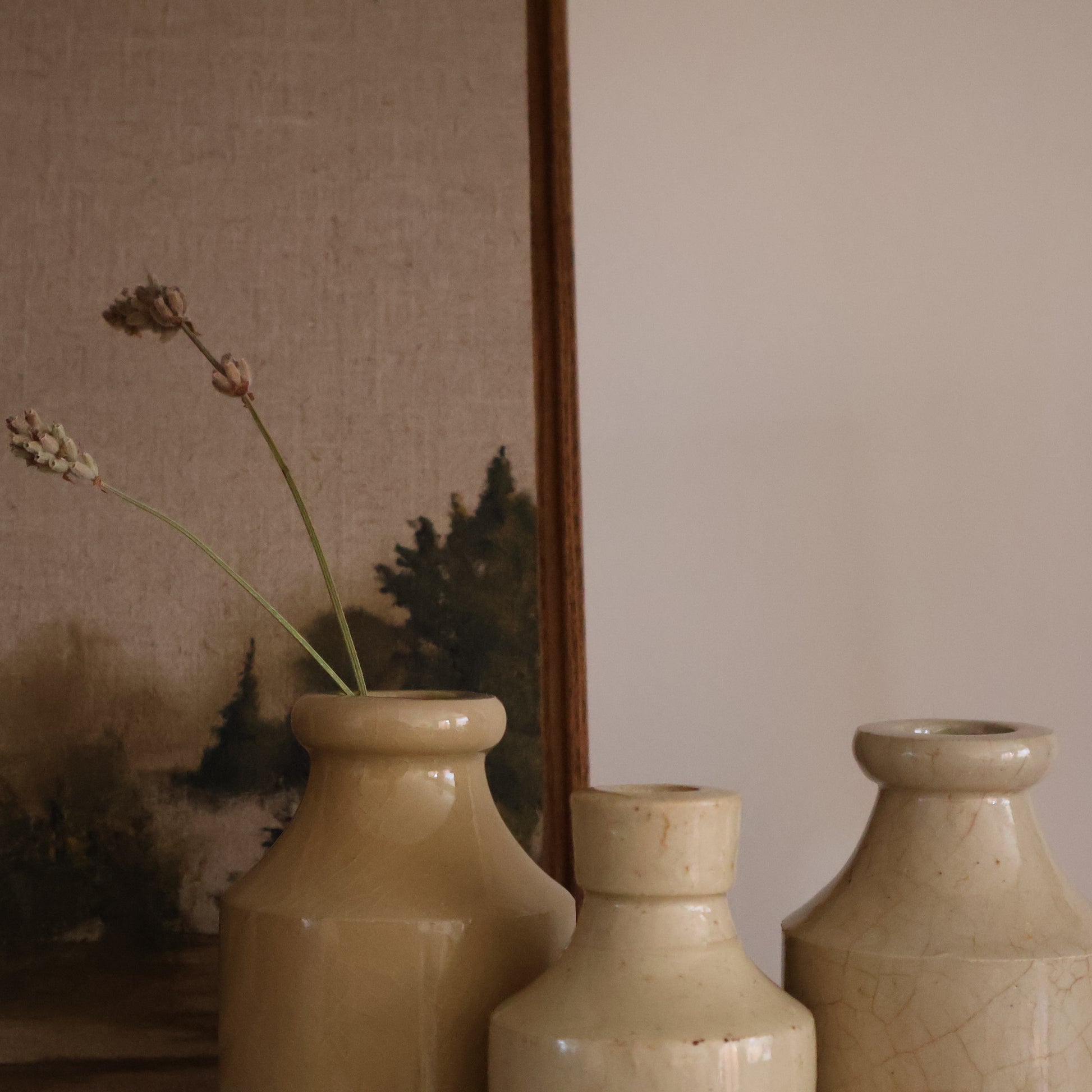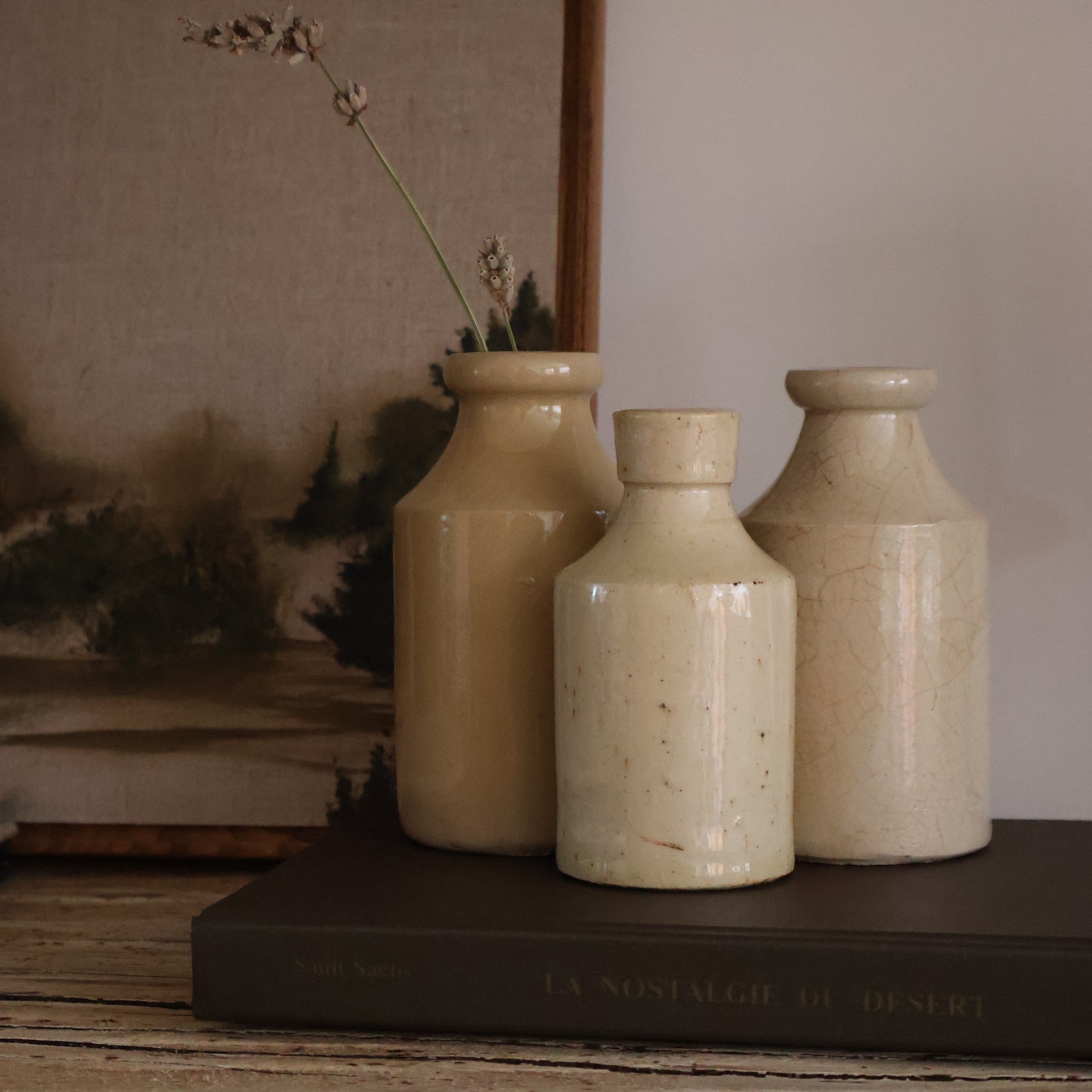 Stoneware ink pots in varying sizes , perfect for a single dried stem or a candlestick. I love grouping them together.