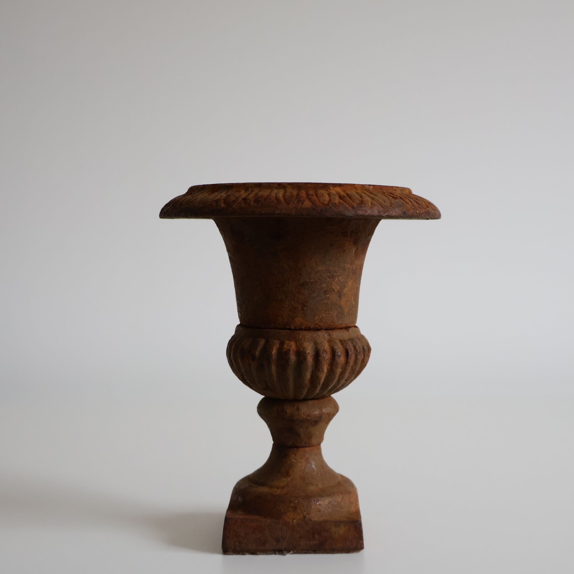 A unique French mini cast iron urn in rich rust brown with lovely detailing , a timeless accent piece for any interior.