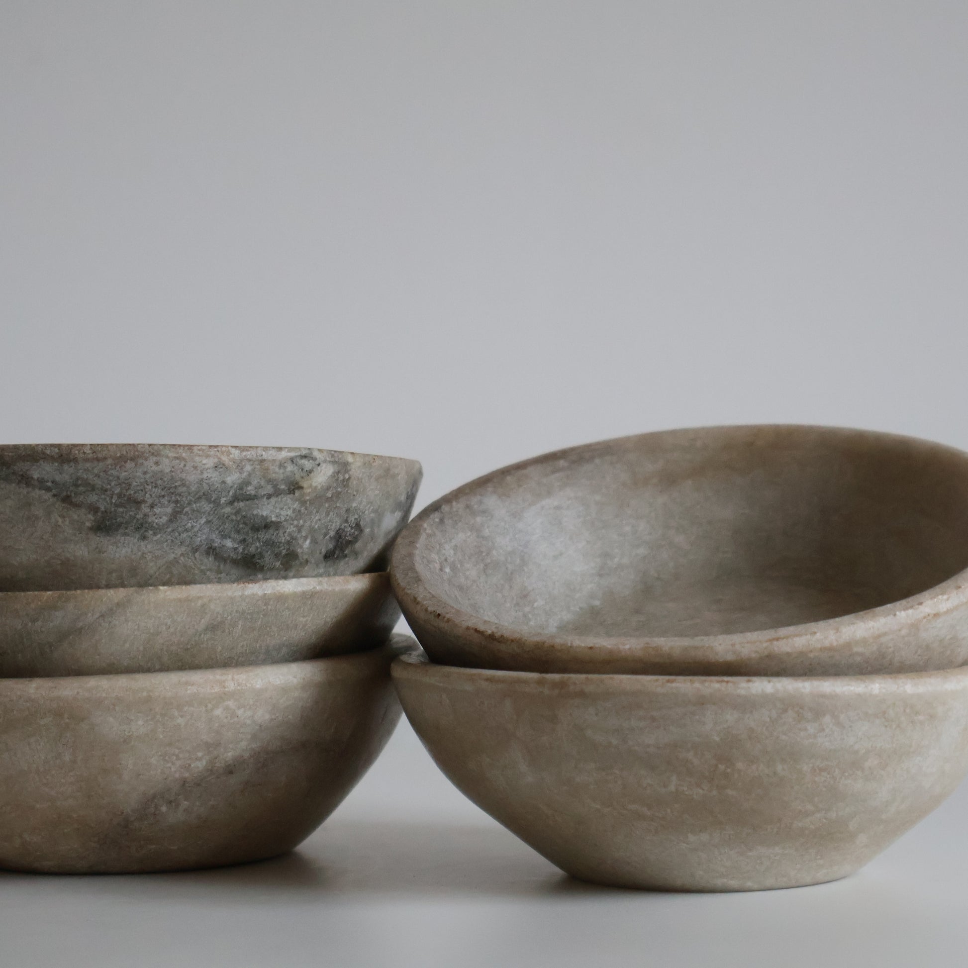 Delicate mini marble bowls, beautifully veined in pale beige and gentle grey hues.