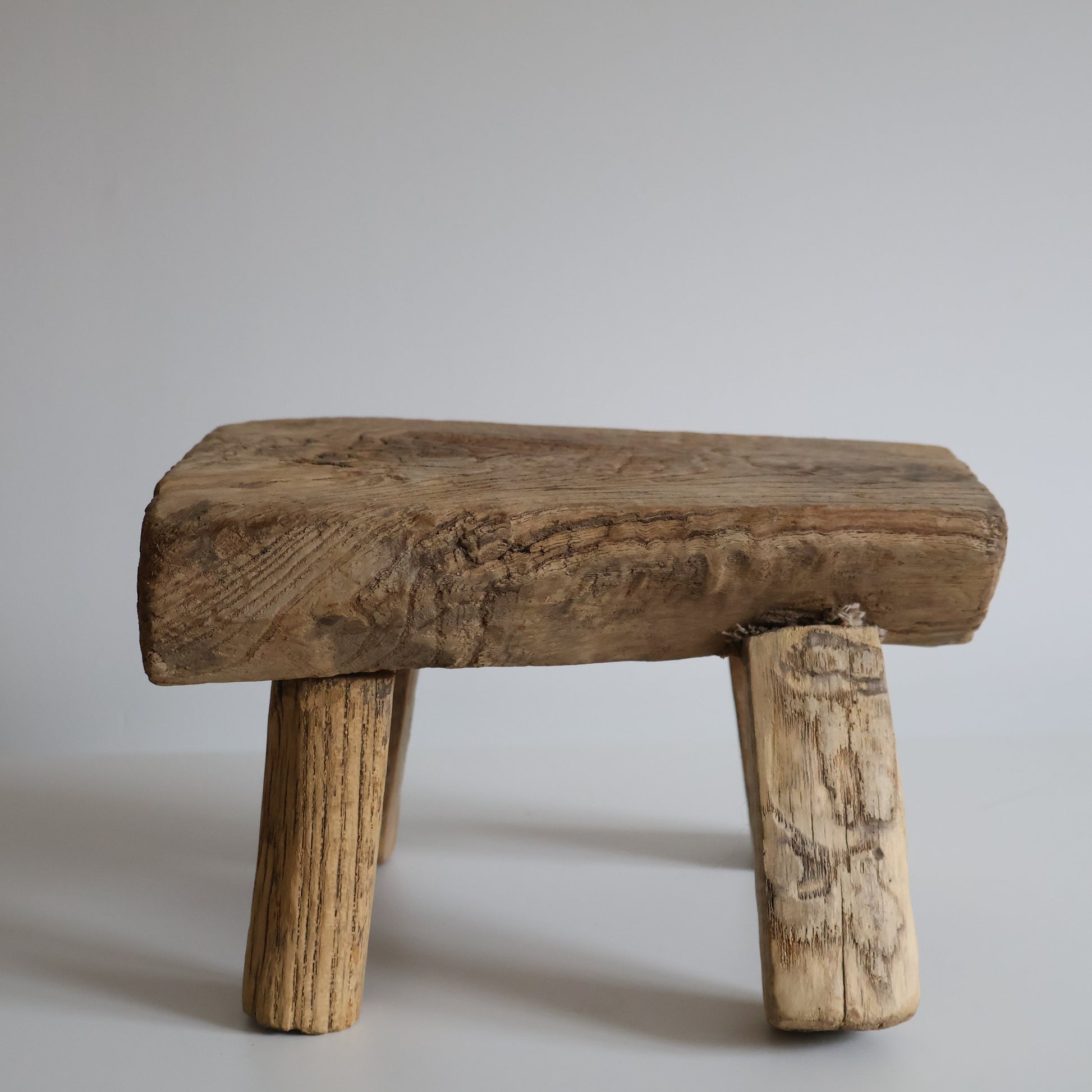 A small rustic elm stool full of character, featuring delightfully mismatched legs and a beautifully grained elm top.