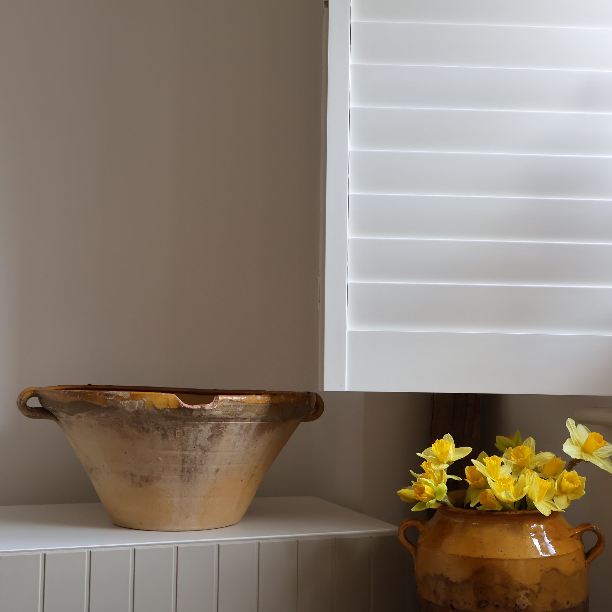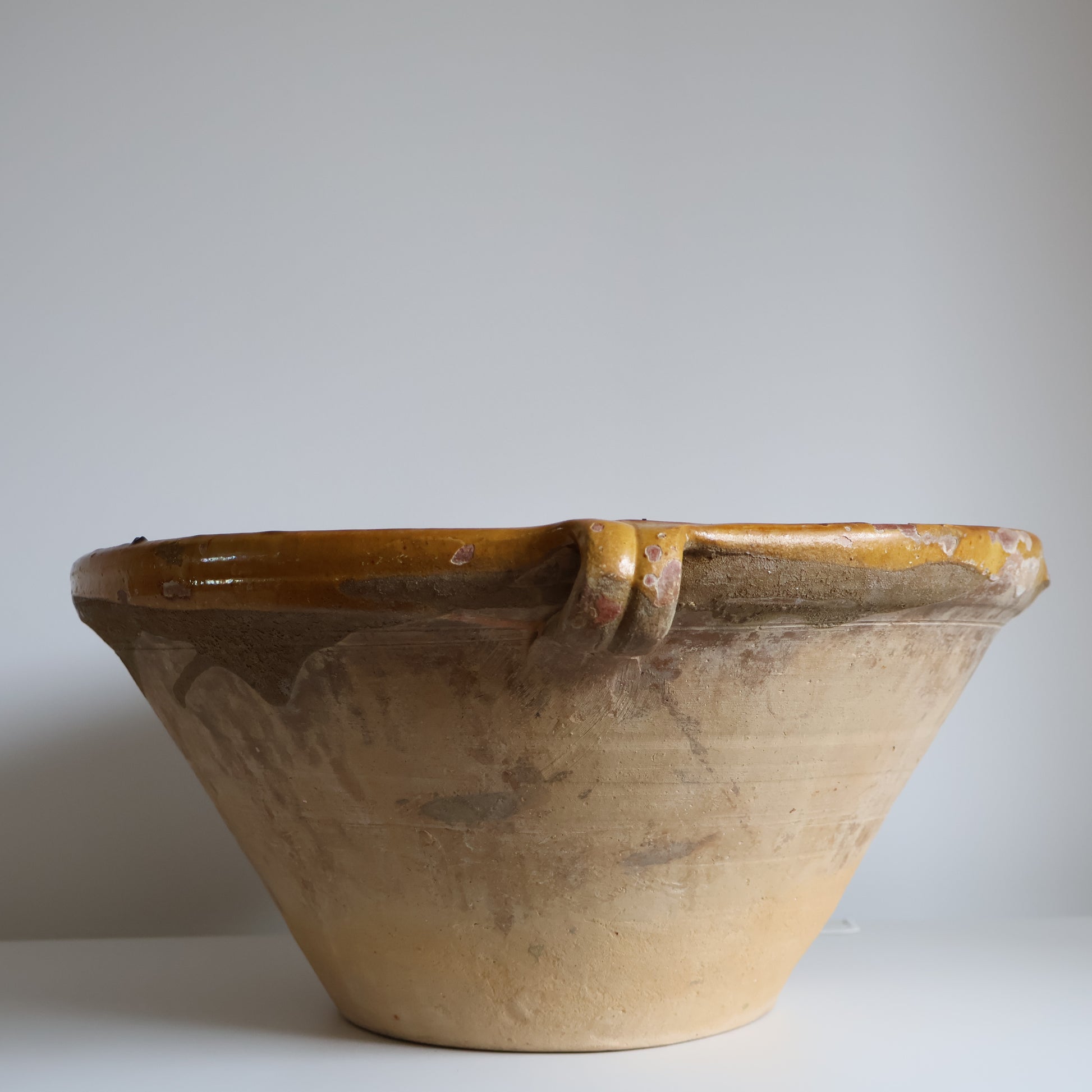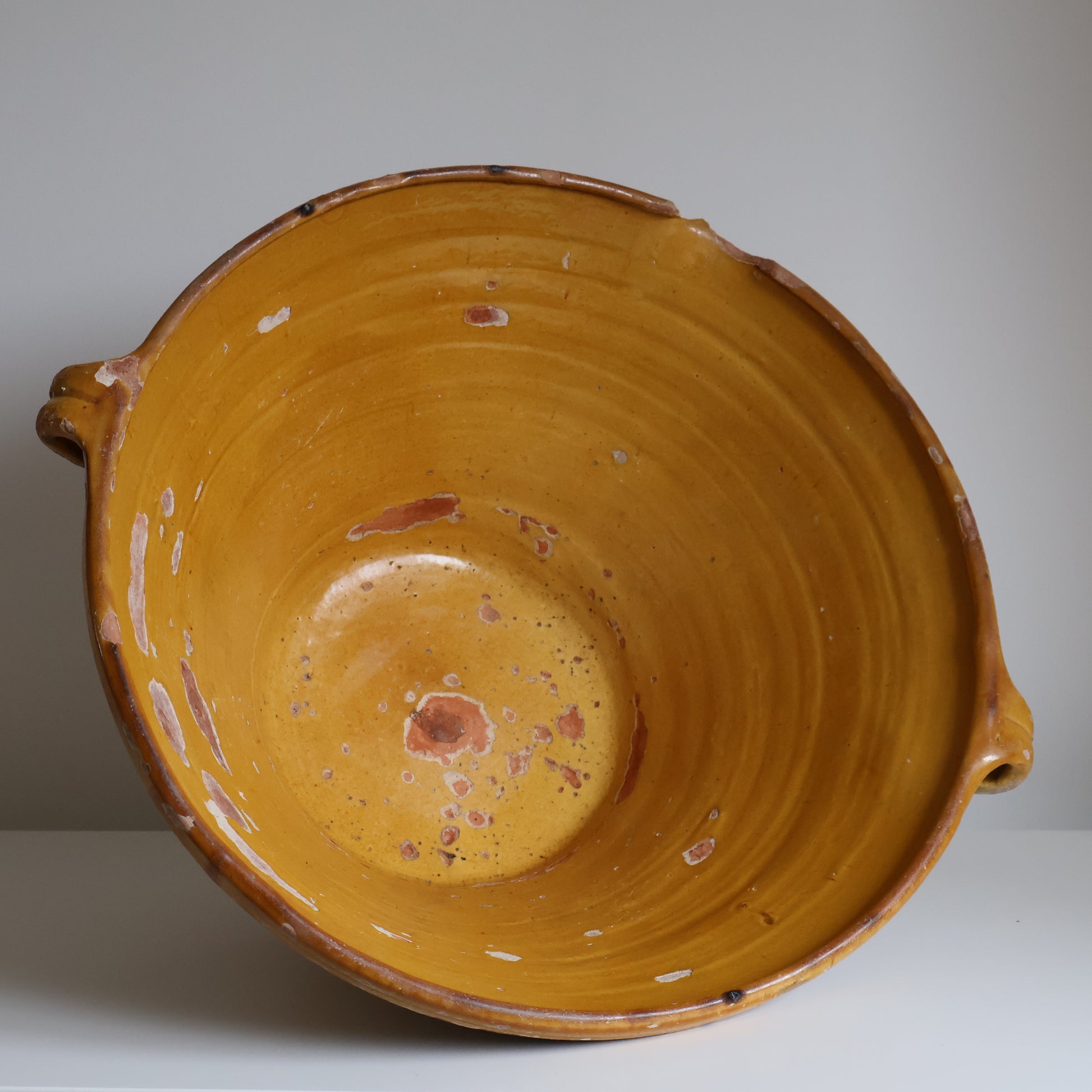 A piece with history, this antique French tian bowl is full of character. Once a staple in French farmhouse kitchens, it now shines as a decorative object. It features a deep yellow interior glaze and a washed terracotta exterior. Please note that due to its age, it presents some chips as pictured.