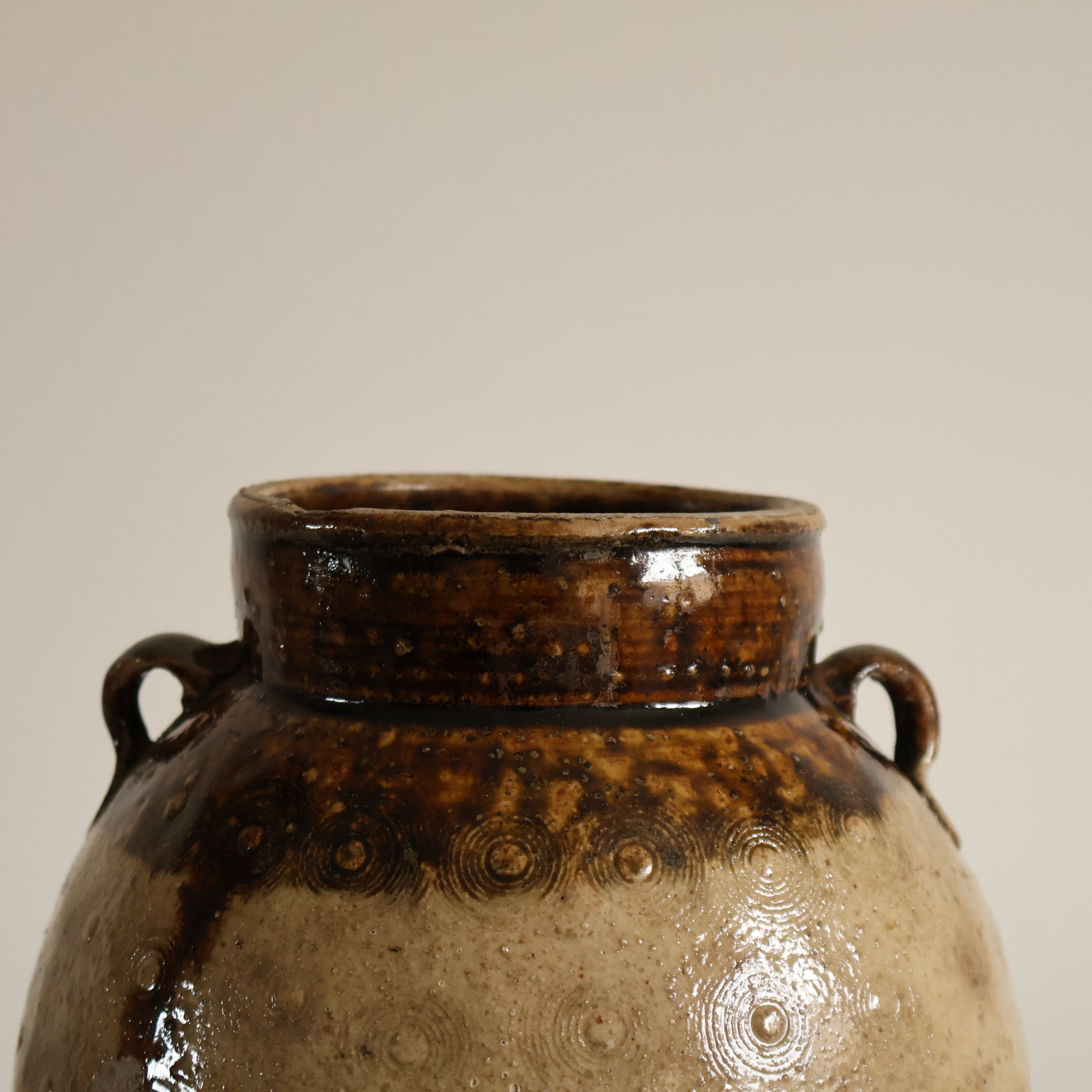 A 19th century medium sized Chinese preserve vessel from the Yunnan region, showcasing beautifully textured surfaces with delicate stamped detailing. Soft taupe tones across the body contrast with a rich brown neck, while the unglazed base provides a natural, understated finish.
